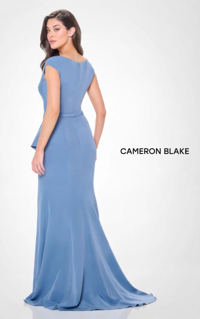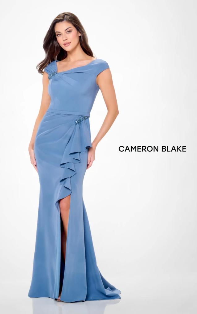 This breathtaking mermaid gown, crafted from soft crepe, offers both style and comfort for an unforgettable entrance. Its thoughtful pleat detailing and sparkling stone accents elegantly slim the waist, while a sultry thigh split with cascading ruffles adds a dramatic flair to this statement piece.