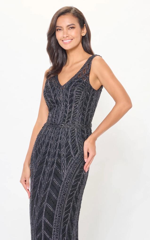 This captivating A-line gown features a shimmering soutache design adorned in sparkling beads and sequins. The flattering v-neckline gracefully highlights the collarbone, while the softly structured bodice and detachable beaded belt accentuate the waist. (Separate three-quarter sleeves and a matching shawl included)