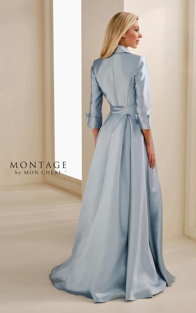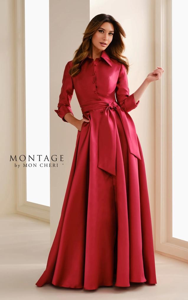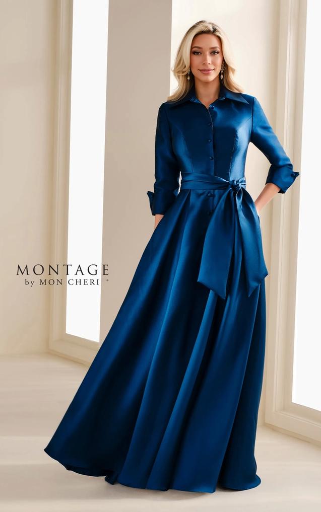 This refined A-line gown offers modest elegance with a classic collar, delicate button detailing, and graceful sleeves. Crafted from luxurious Mikado fabric, it features a coordinating belt that accentuates the natural waist for a timeless silhouette.