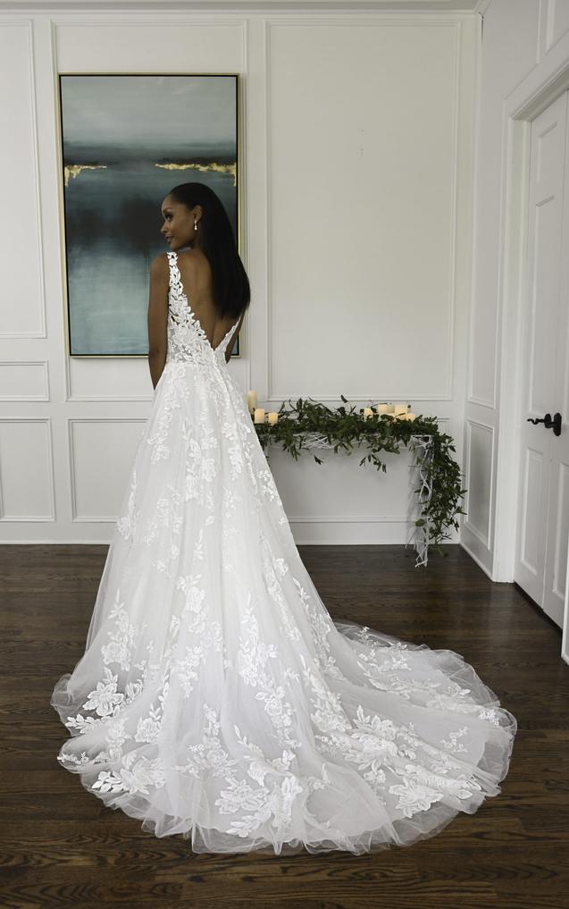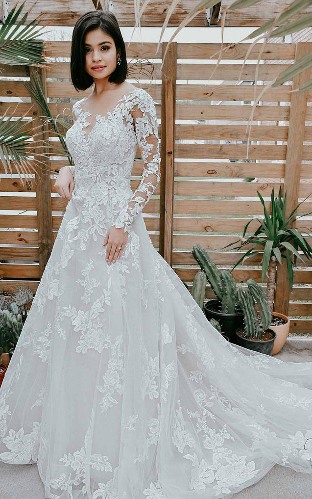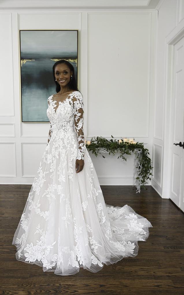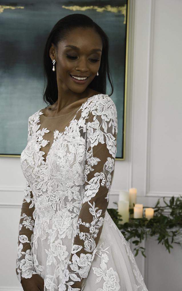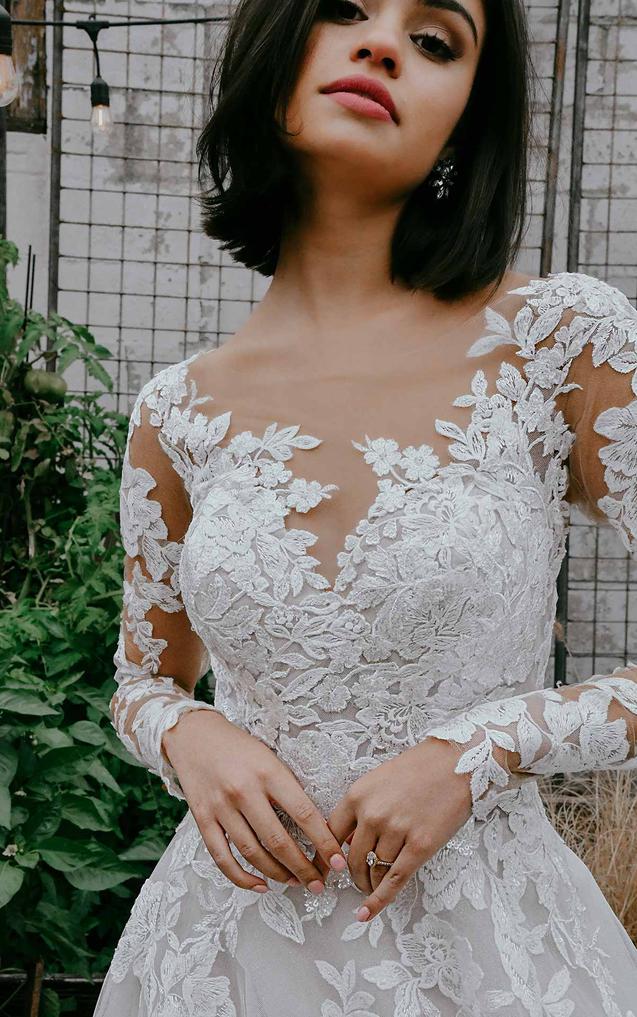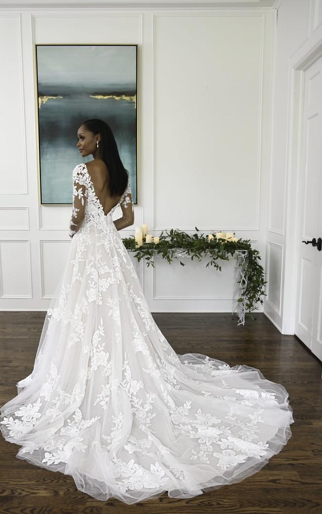 (Available Long or Short Sleeves) Beautiful, traditional floral laces vary in scale and layer in an extraordinary way to create a stunning dimension throughout this elegant silhouette–floating gently over the neckline to create a floating V-shape that carries into the floating V-back.