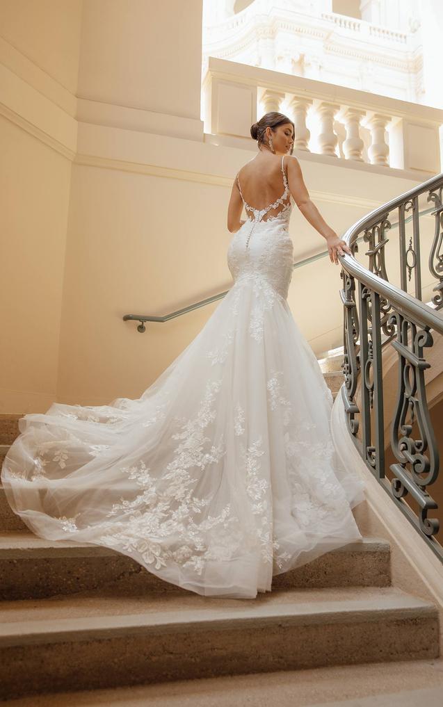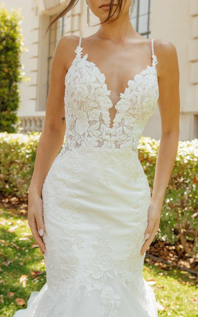 With a touch of sparkle, the beaded spaghetti straps on this fit and flare gown meet a natural edge of rosette lace for a romantic appeal. Plunging into the sheer bodice, an ultra-flattering deep V-neckline is outlined in charming botanical lace. From the deep side cutouts, a low illusion lace back adds a touch of floral appeal over bare skin for a sexy low back detail.
