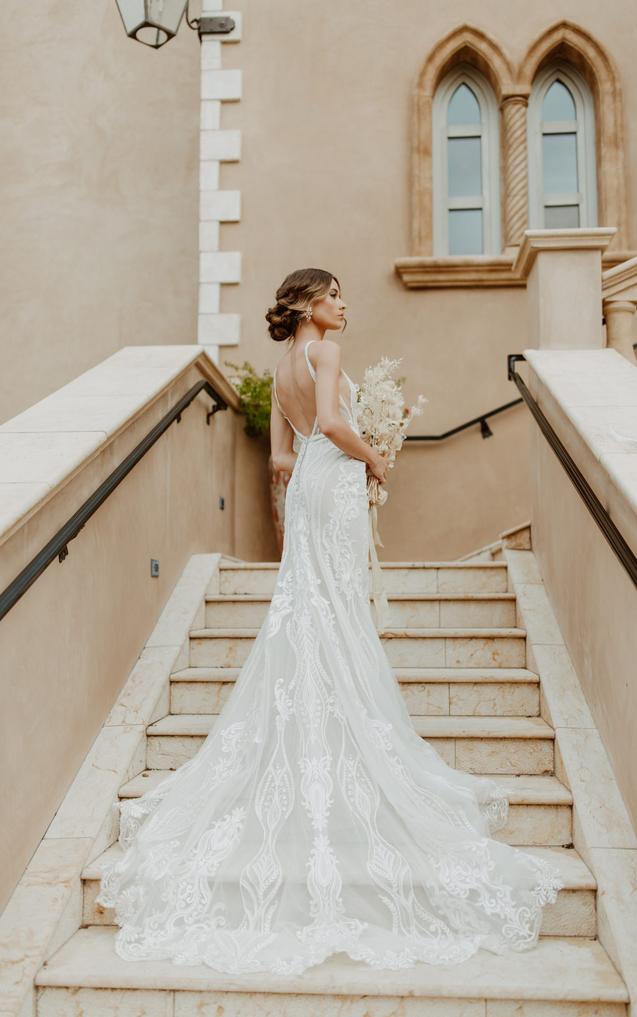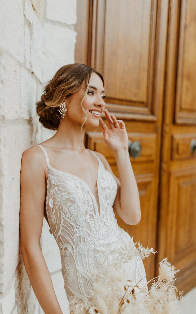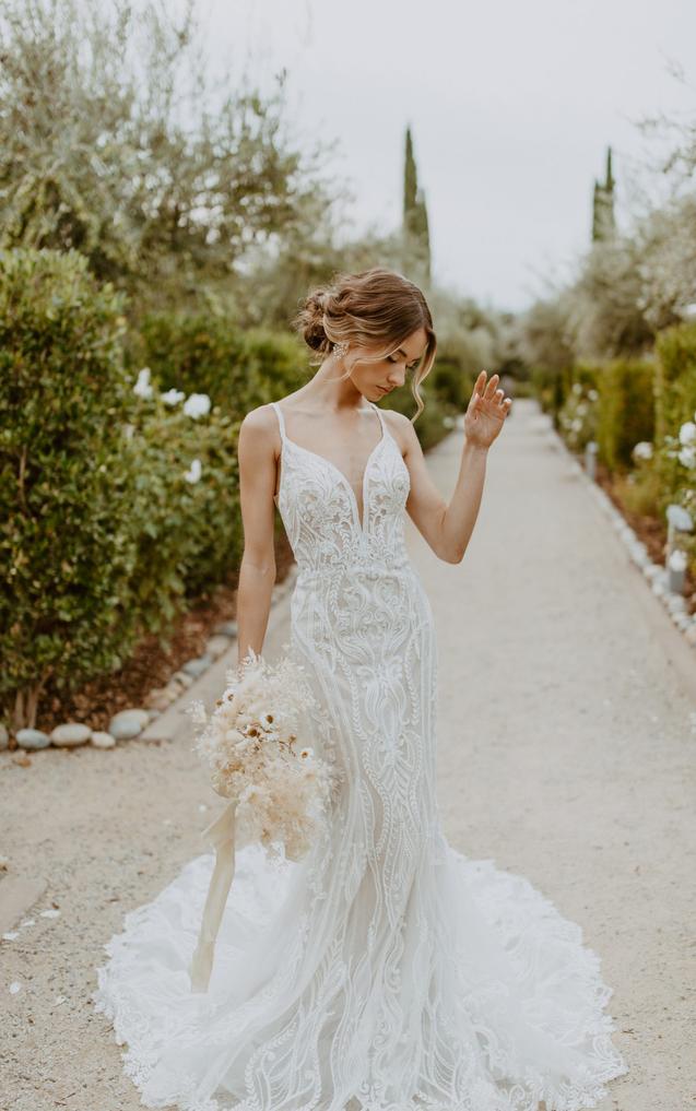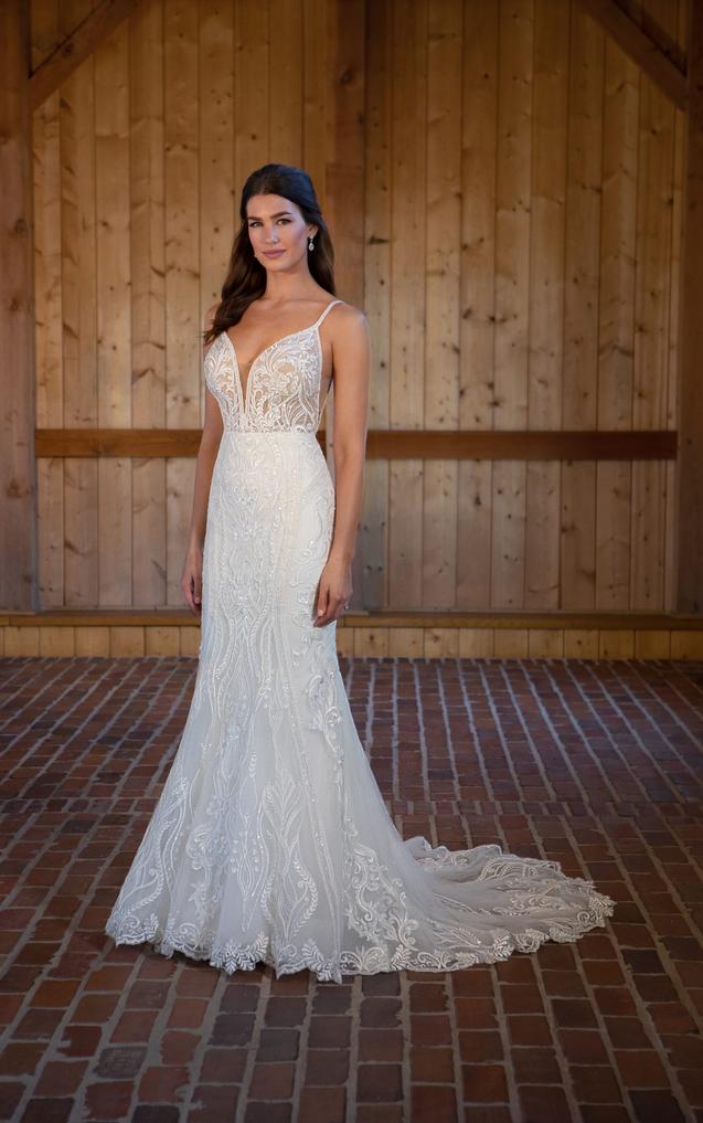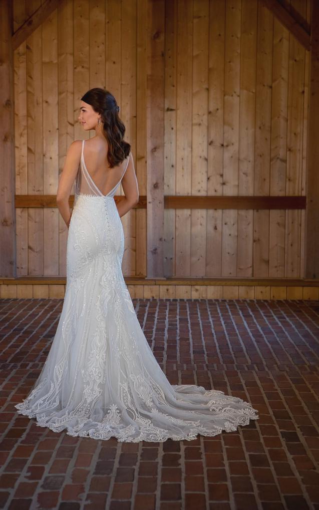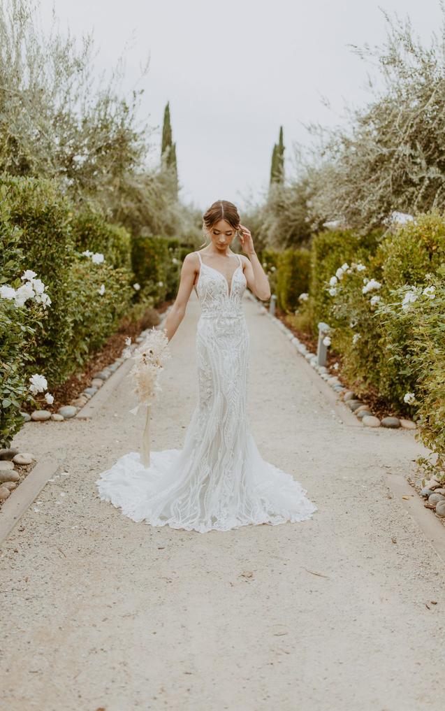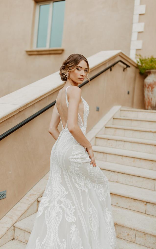 This lace gown accentuates the figure in a body-skimming fit-and-flare silhouette with sparkling details and an ultra-flattering deep plunging neckline with illusion tulle. The sexy side cutouts lead to a daring V-shaped open back with artful linear beading and a fabric-covered button back detail. From the natural waist, the vertical beaded graphics conclude in a romantic lace-trimmed scalloped train.