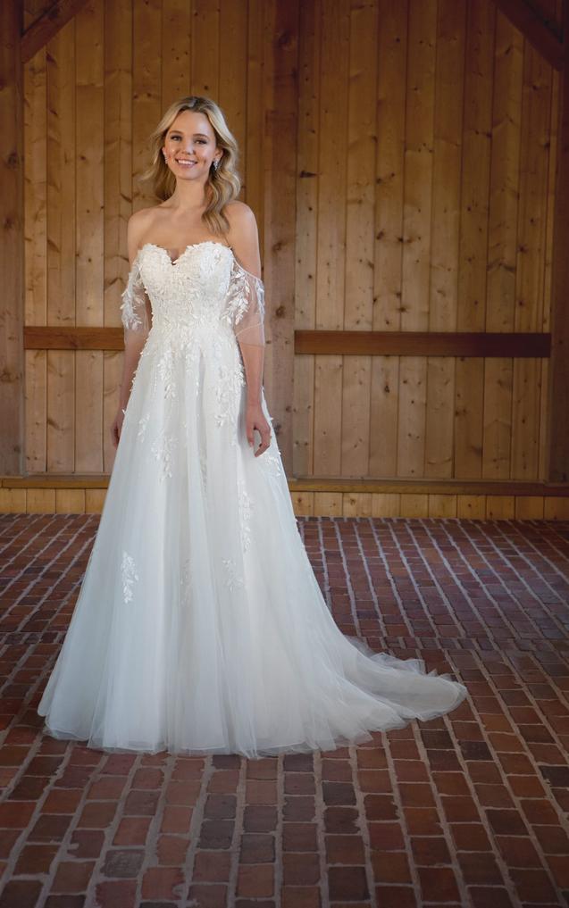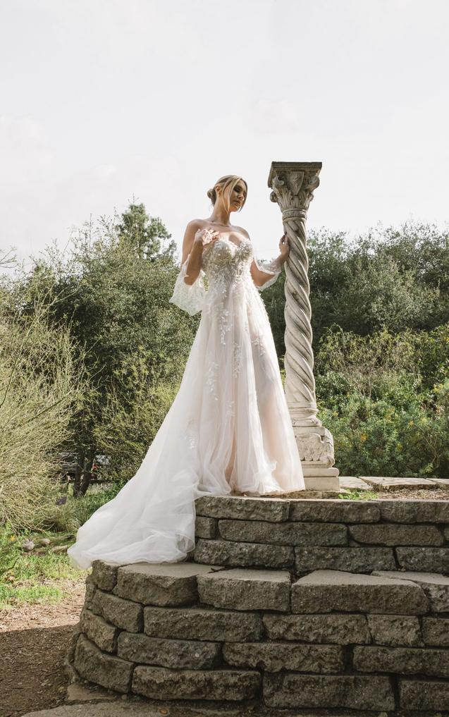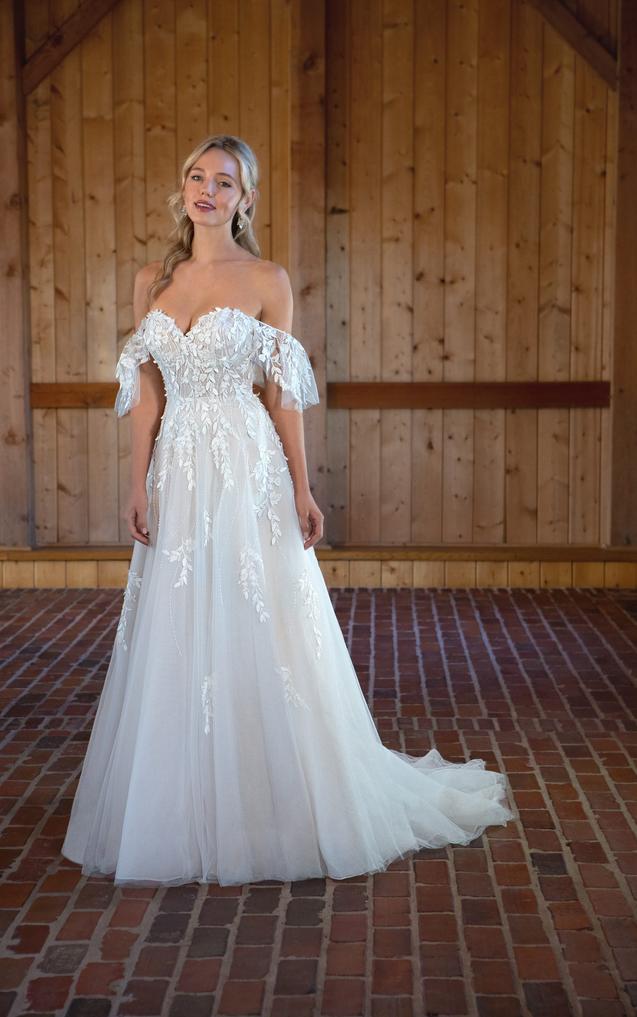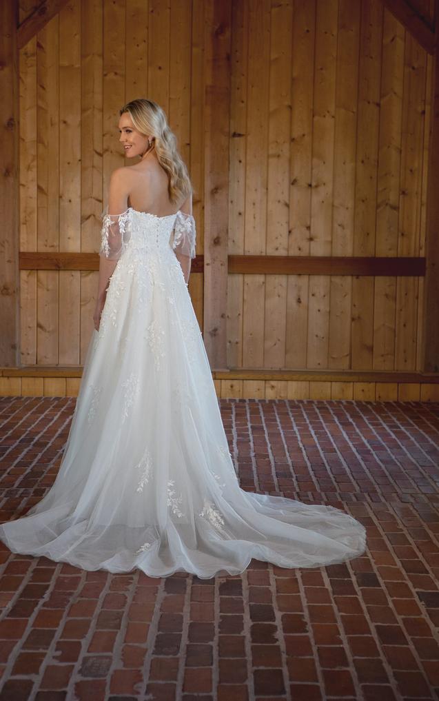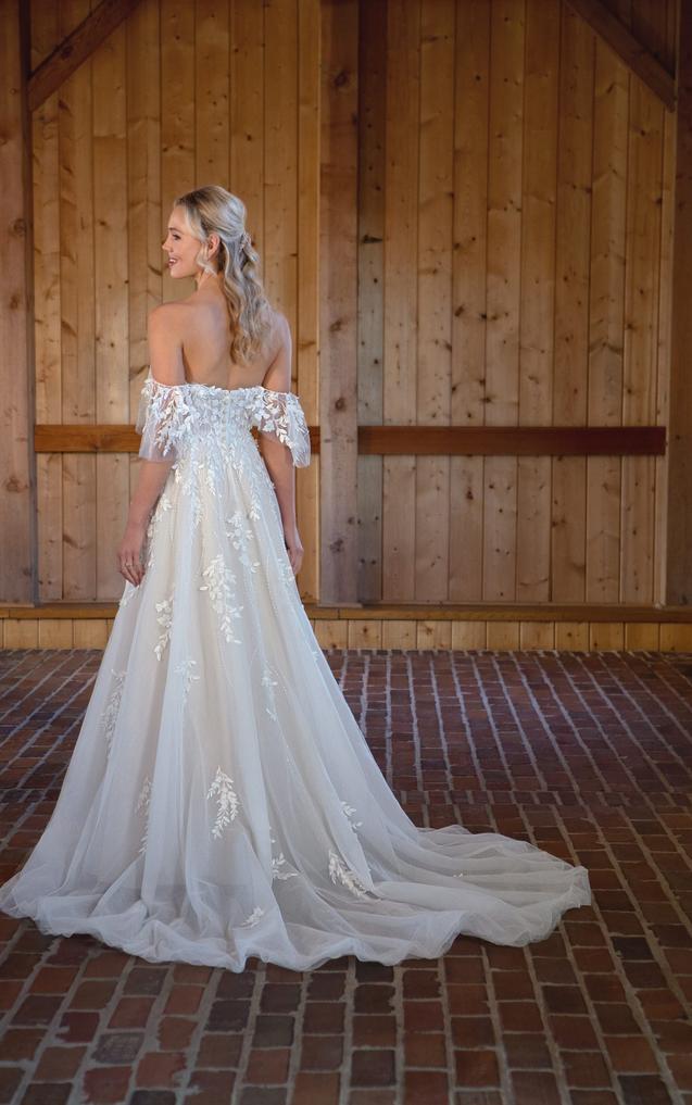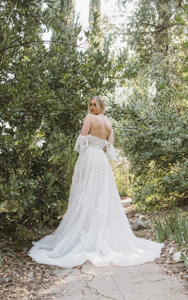 (Available Lined or Unlined Bodice) The romantic and sheer off-the-shoulder sleeves capture a glamorous boho vibe with natural vine leaf appliques and embroidered beaded detail. The detachable sleeves join the flattering sweetheart neckline, while delicate organza florets are artfully placed upon the fitted bodice and cascade down the tulle skirt.