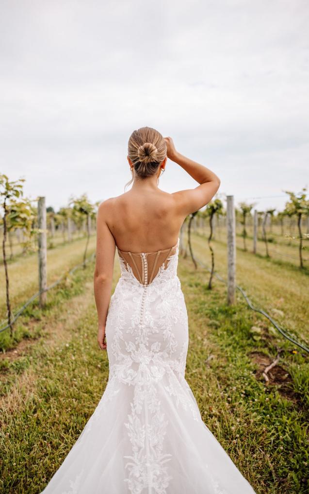 The strapless sweetheart neckline of the sheer bodice highlights the architectural corsetry, combining Old World romance with contemporary linear fashion design. The illusion tulle back with exposed boning and a single row of fabric-covered buttons highlights the bodice even further for a timeless appeal.