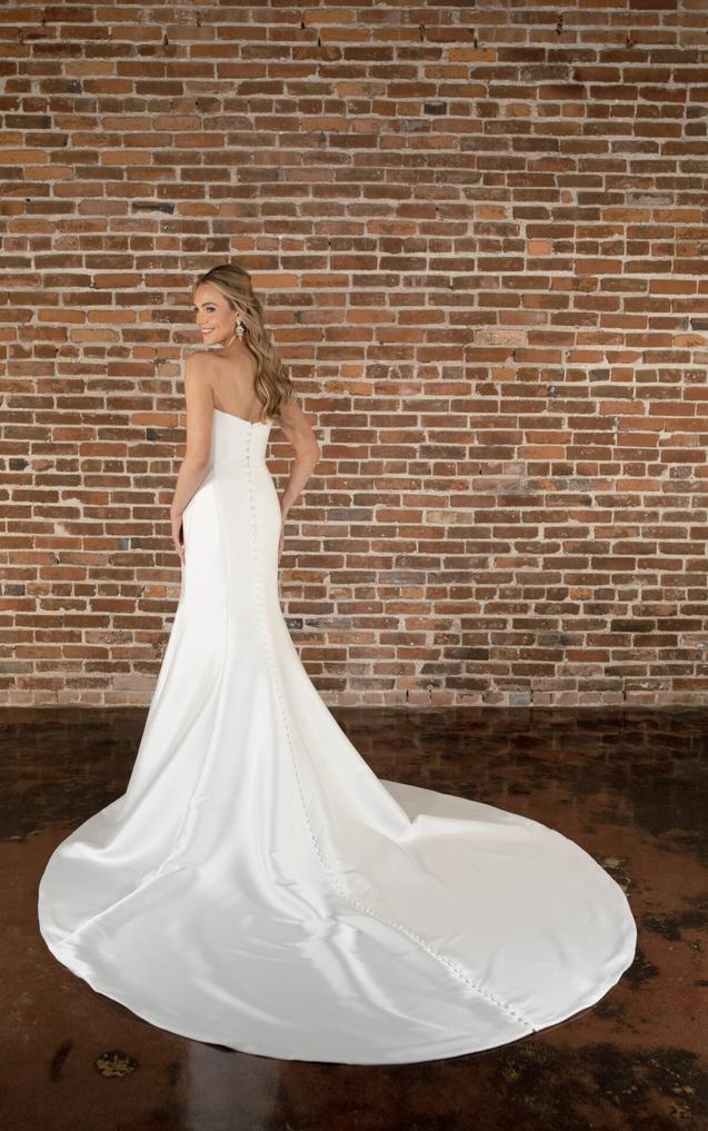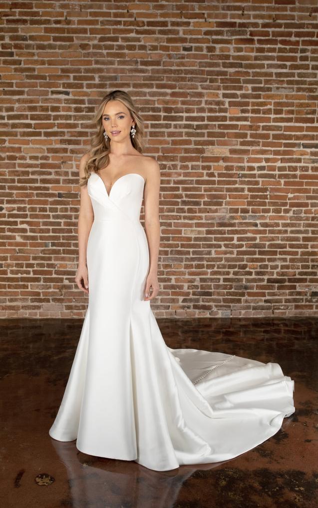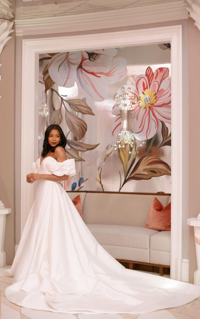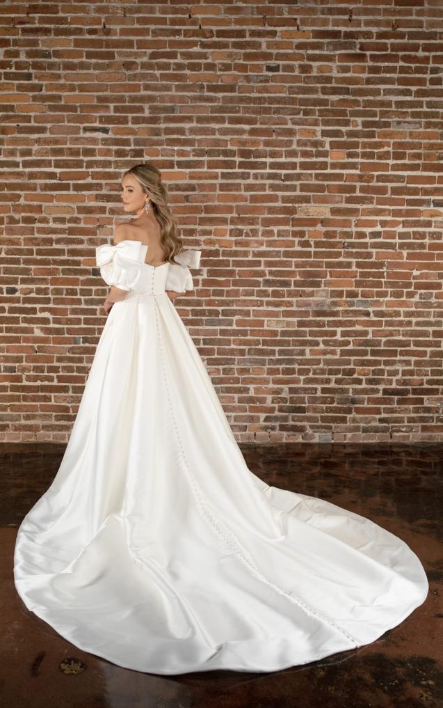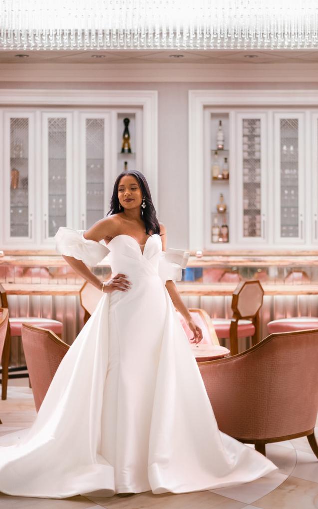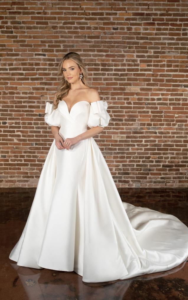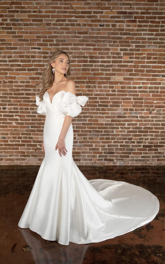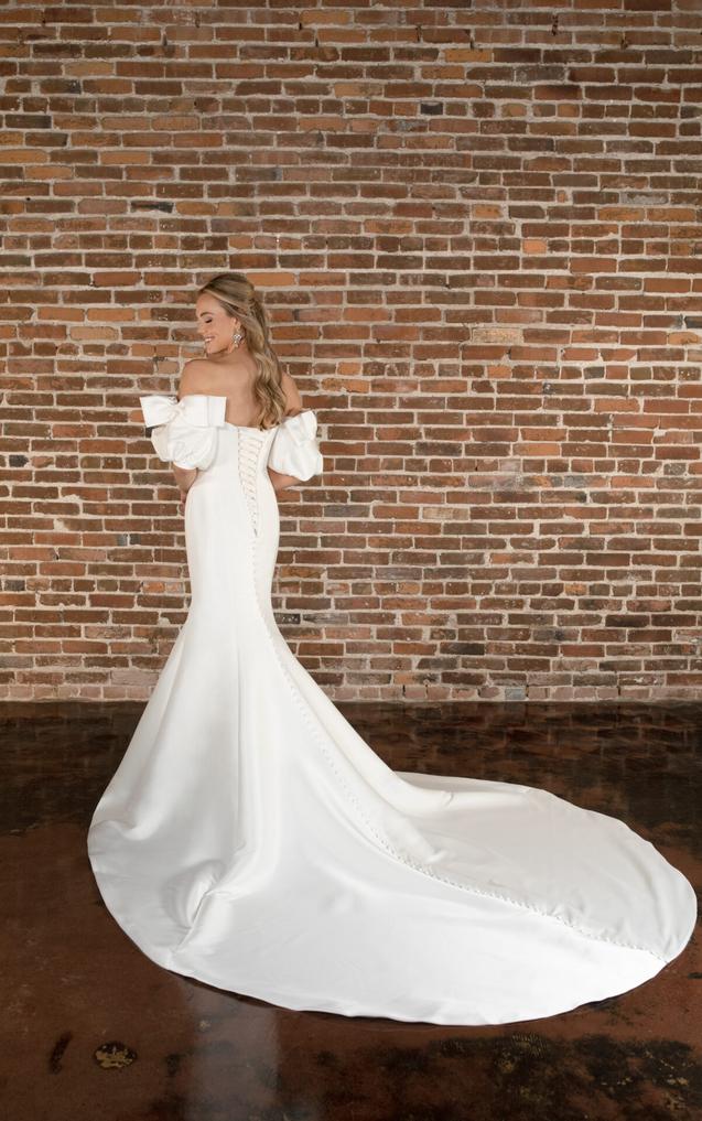 Optional off-the-shoulder bow sleeve details can be added for a versatile runway-worthy bridal look. The flattering fit-and-flare silhouette hugs the figure past the hips with elegant contour seaming and lengthens into a sleek contemporary train. To turn up the volume on this glamorous gown with the detachable silk overskirt.