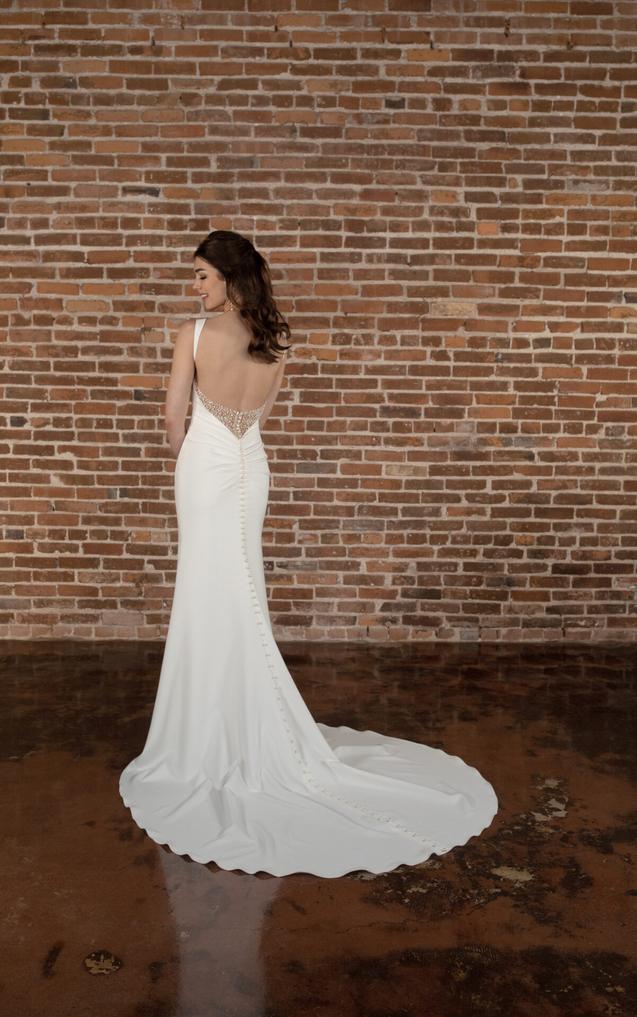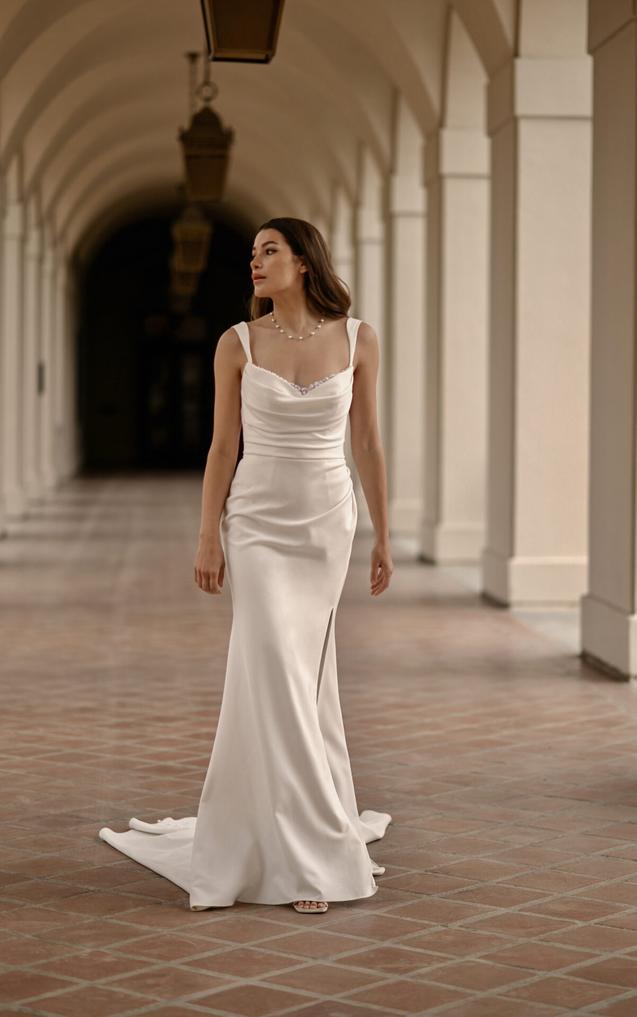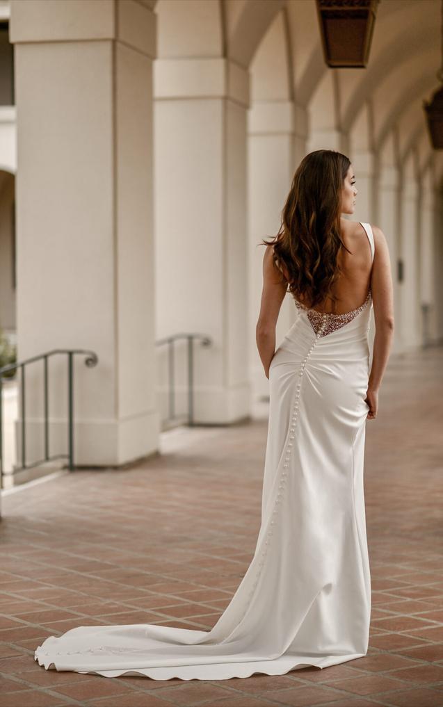 This clean and modern gown features wideset shoulder straps and a draped scoop neckline with an alluring hint of pearl beaded accents. More shimmering pearls embellish the low open back detail that concludes with a fitted ruched hip. In luxurious crepe satin, this gown concludes with a soft sweeping train.