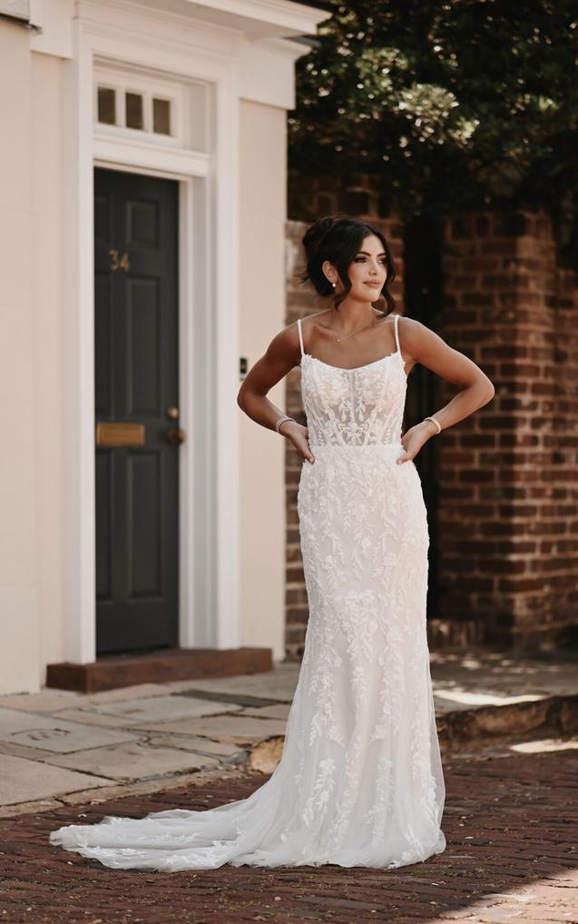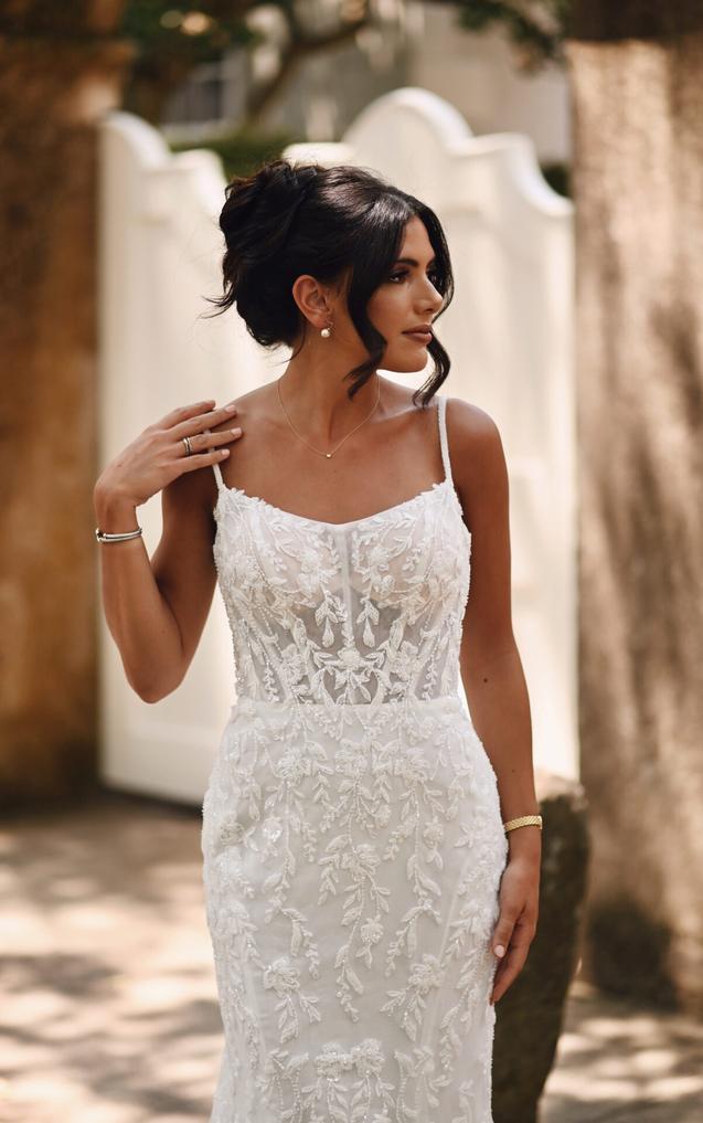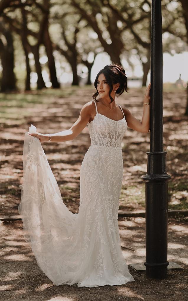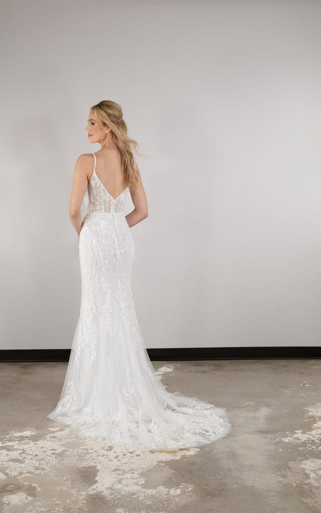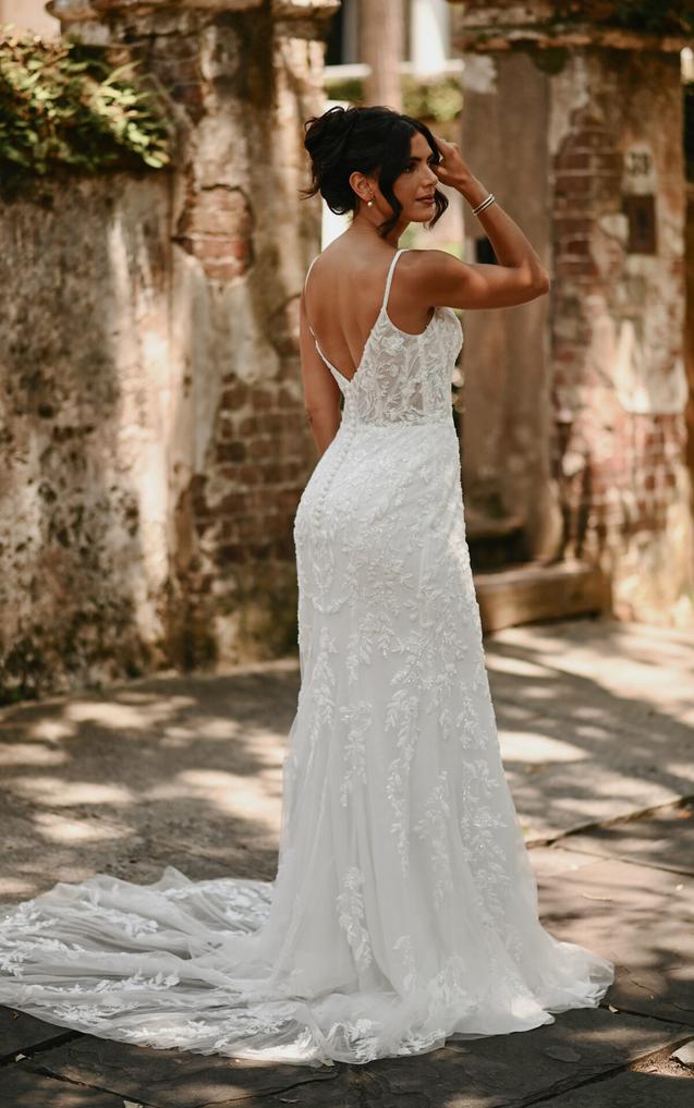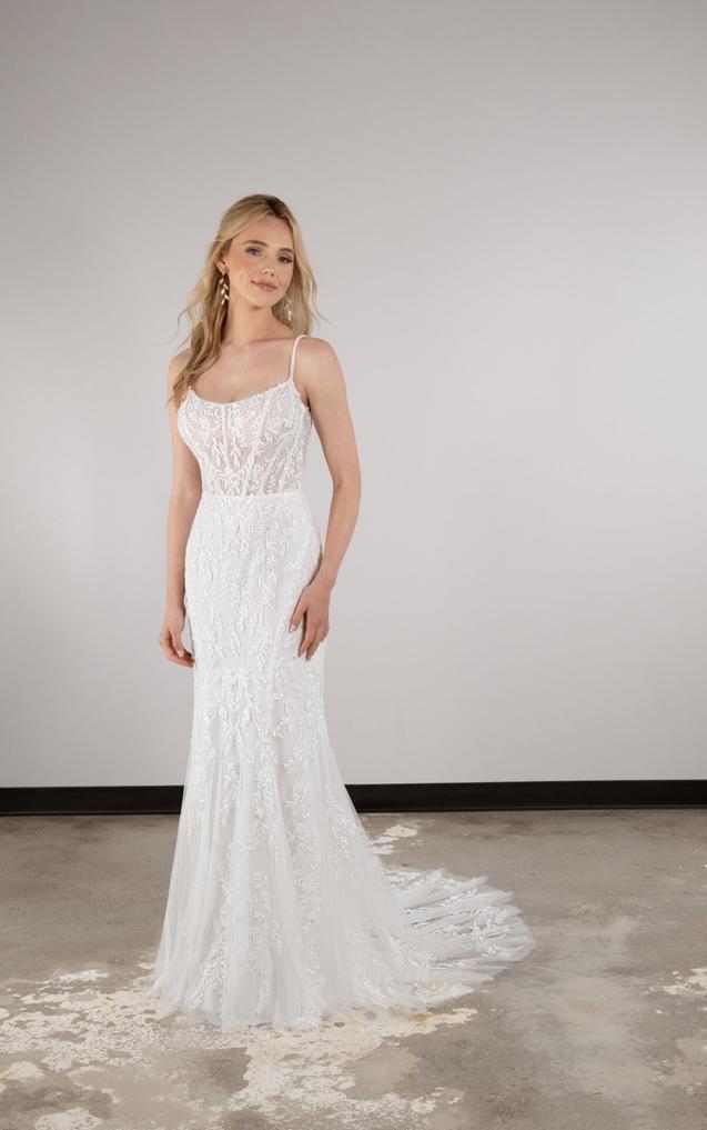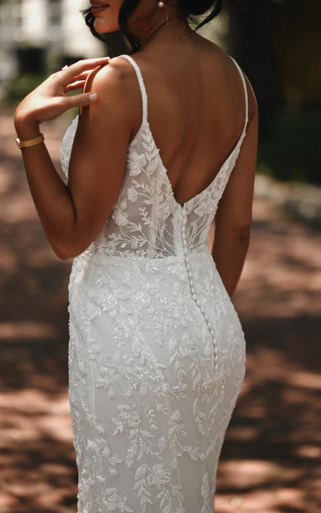 (Unlined or Lined Bodice) The straight neckline on this embellished lace gown is modern yet timeless with the instricate all over details. The bodice shows a sheer corset look to add a touch of fashion-forward vibes while the V-back feeds into classic fabric covered buttons.