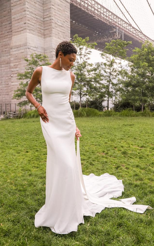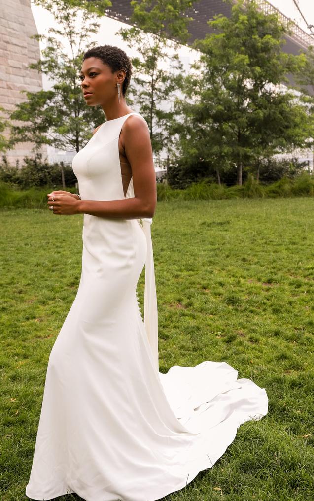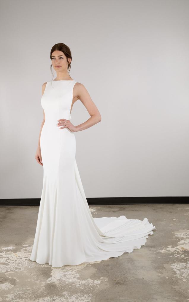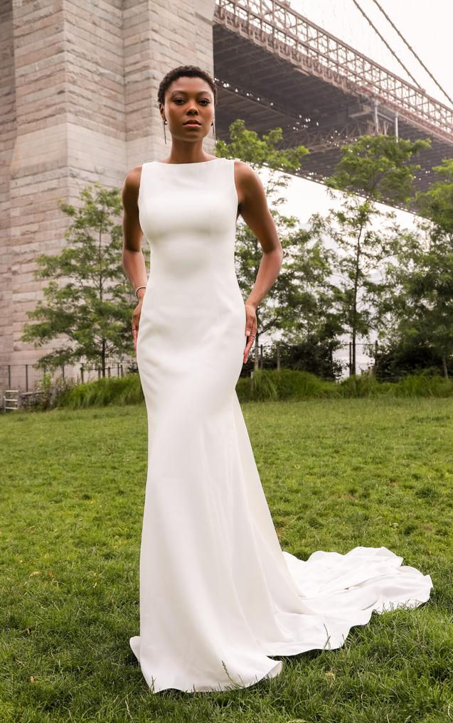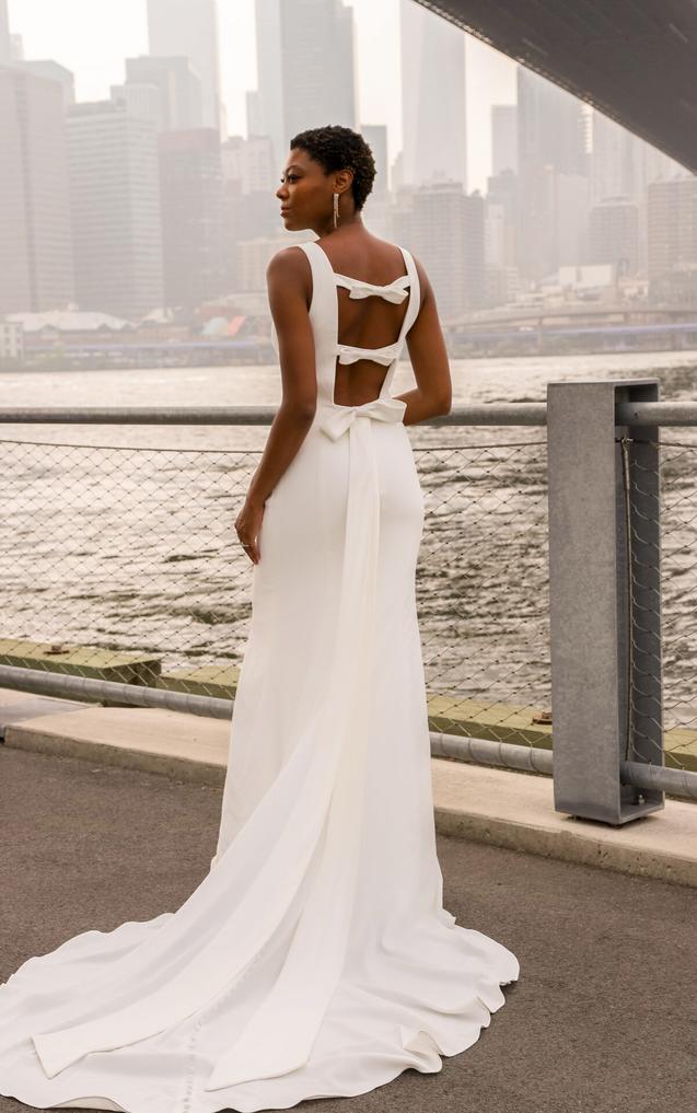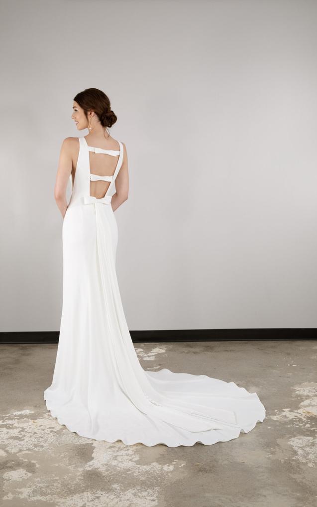 This wedding gown begins with a high boatneck neckline that meets simple and elegant shoulder straps. Fitted to every curve, the sleek column silhouette forms a luxurious minimalist front that joins a sophisticated back detail via two sharply pointed side cutouts and three chic bows.