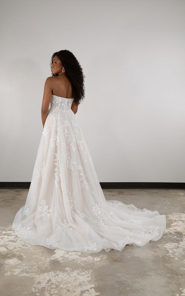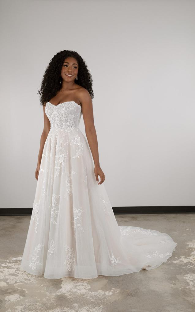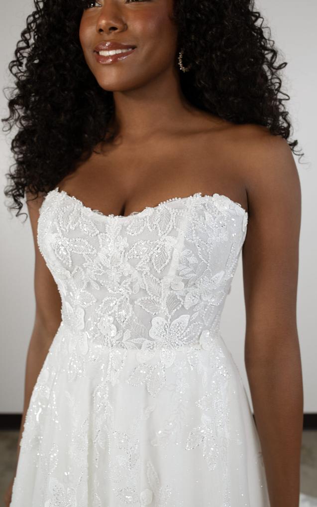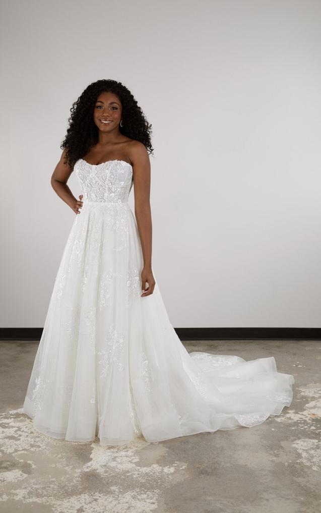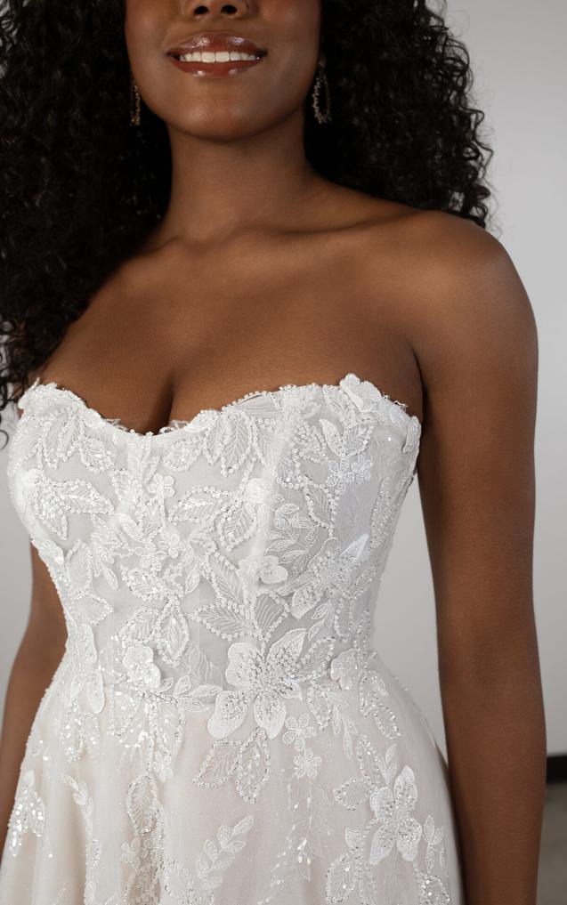 (Unlined or Lined Bodice) The strapless bodice features a modern scoop neckline as delicate lace appliqués embellish throughout. From the waist, the gentle A-line silhouette delicately melts into a soft skirt and train, shimmering and catching the light with its glittering tulle beneath.