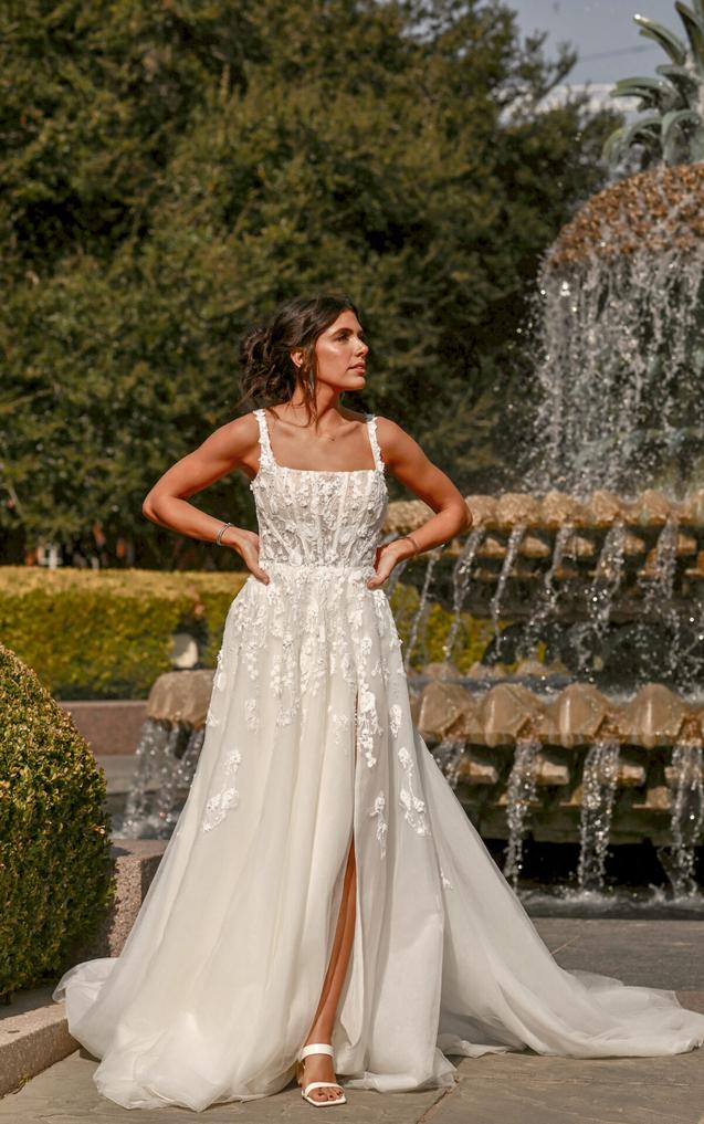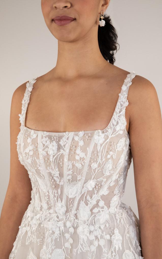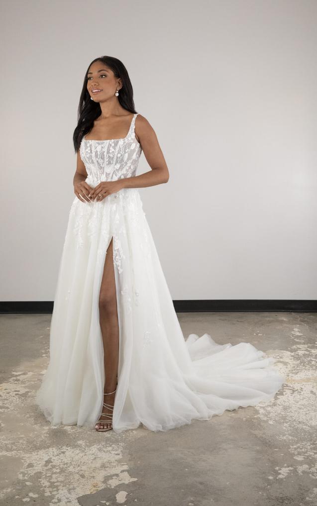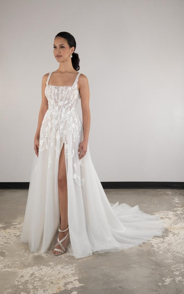 From embellished shoulder straps, a classic square neckline introduces a sheer corset bodice with pearl button closures in the back. From the waist, the timeless A-line silhouette softly skims the figure, opening at the thigh for an alluring leg slit as delicate lace appliqués scatter across flowy layers of tulle.