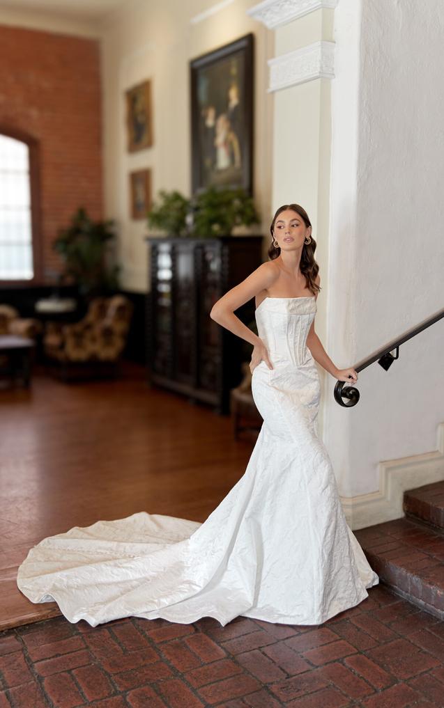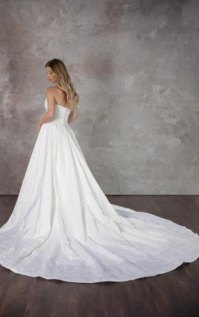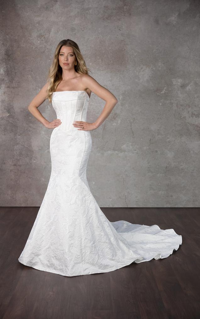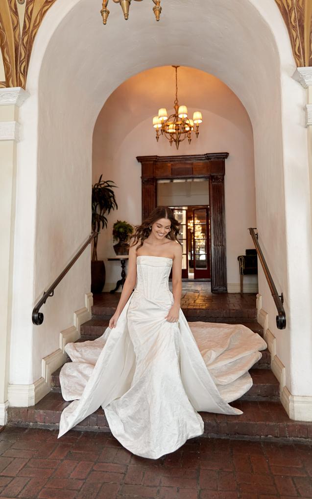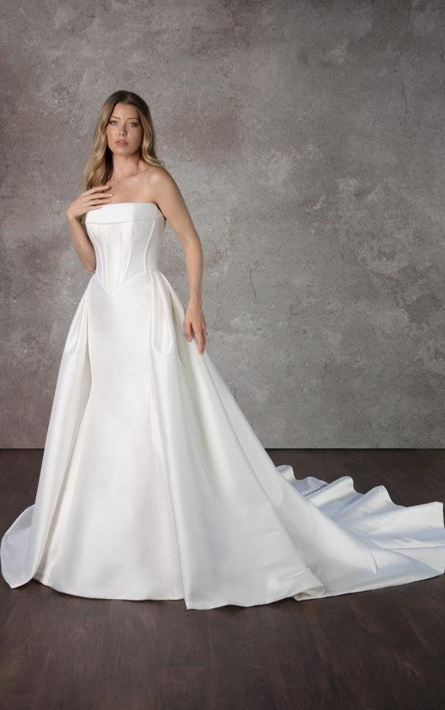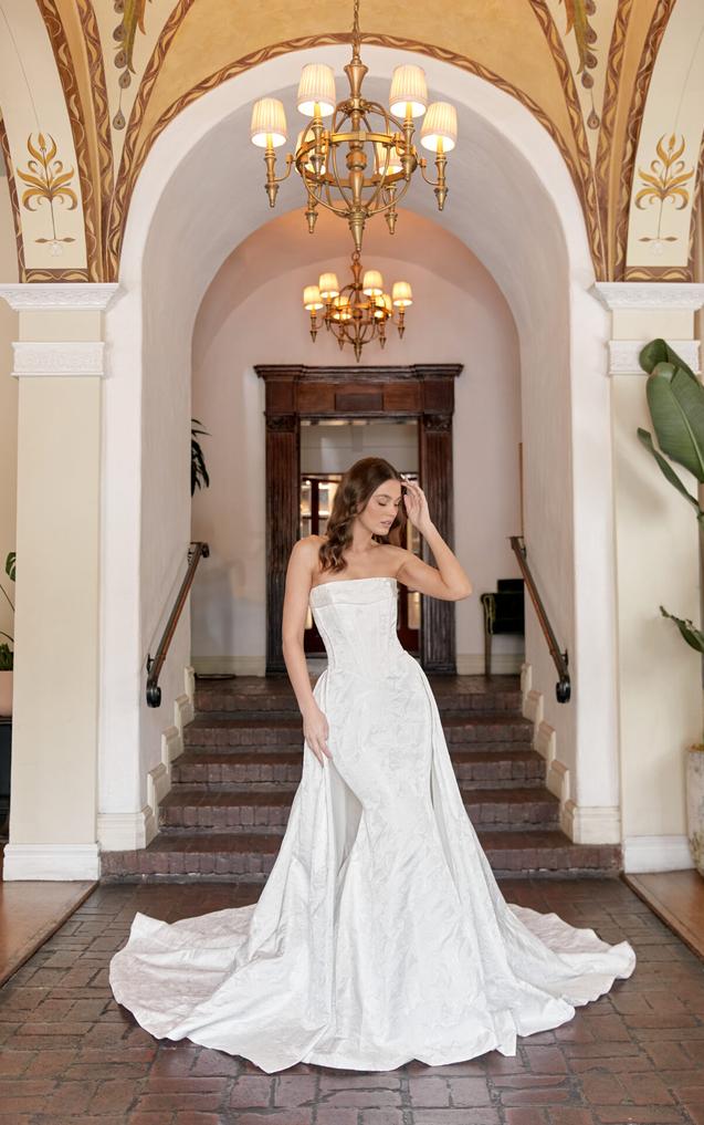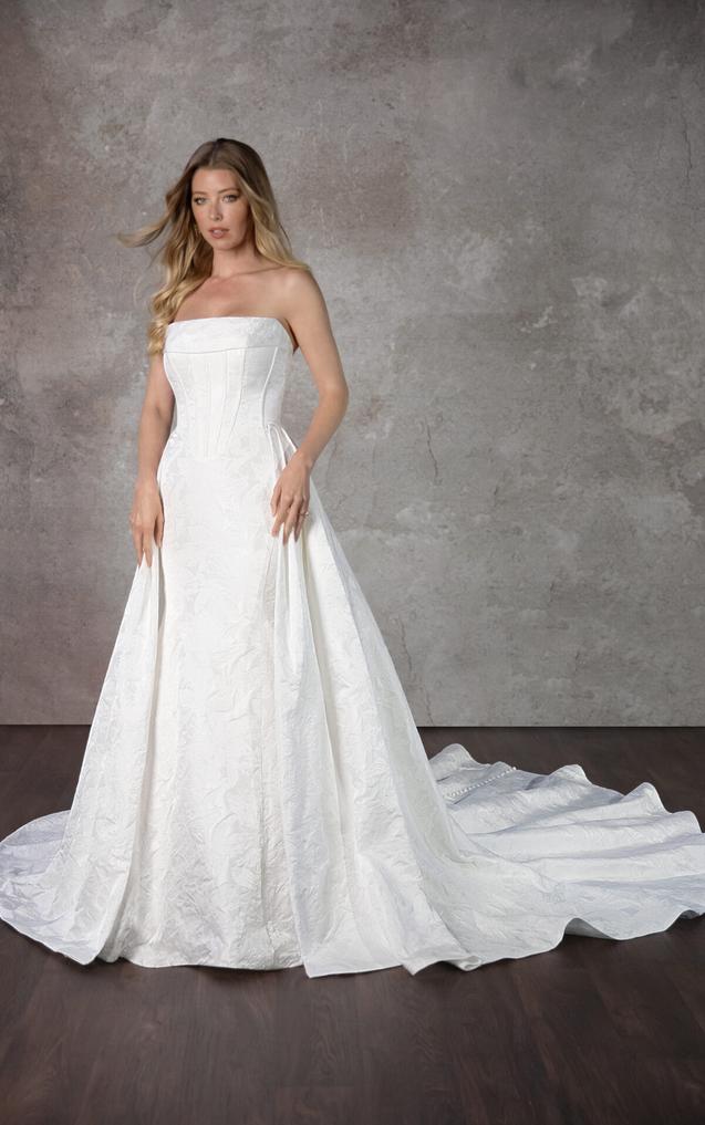 (With or Without Overskirt) (Mikado or Satin Jacquard Fabric) This gown features a straight-across strapless neckline, introducing a fully-lined bodice exquisitely tailored to reveal architectural corset boning that leads to a timeless Basque waist.
