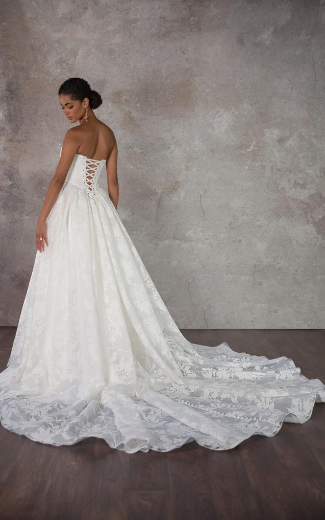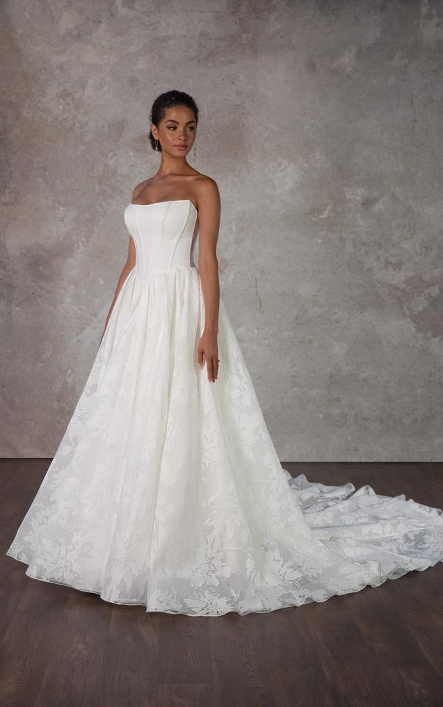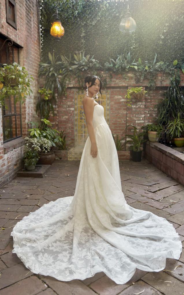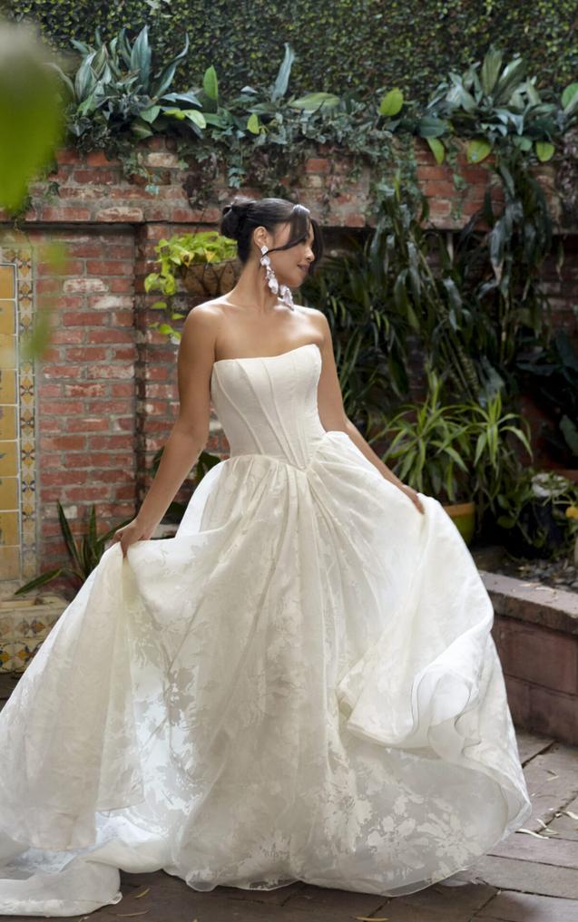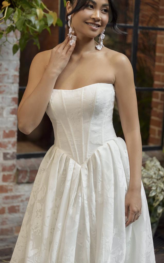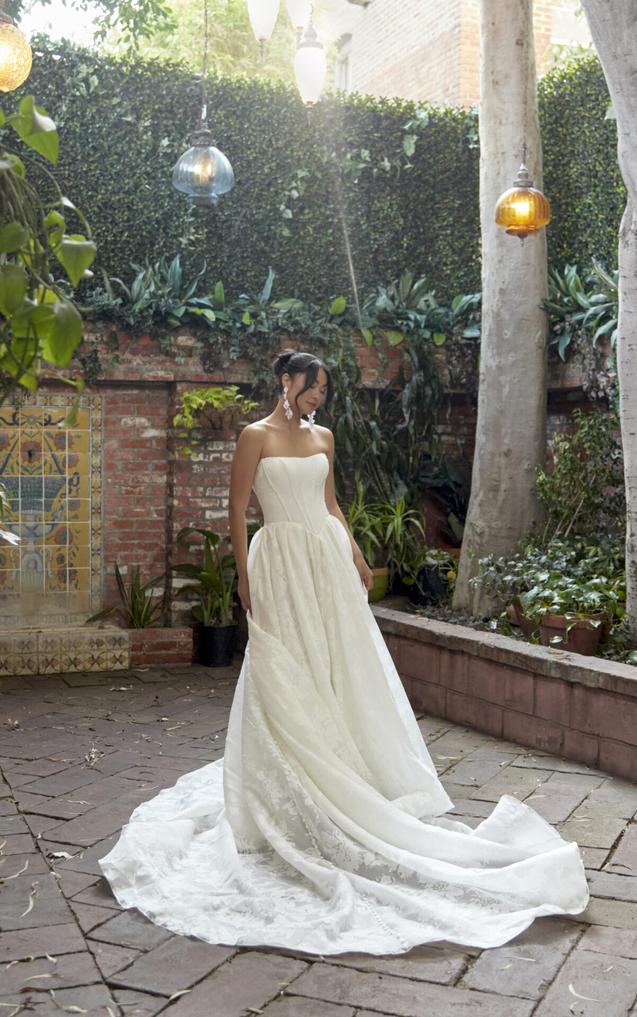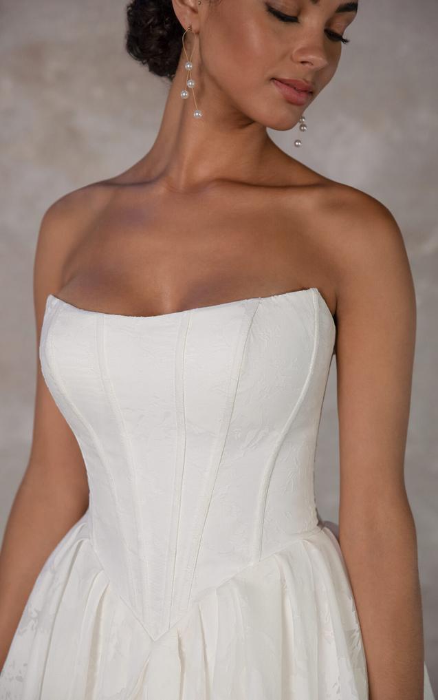 (Organdy Jacquard or Luxe Organdy Fabric) Featuring a strapless scoop neckline bodice with vertical contouring seams, the fully-lined bodice accentuates the figure while complementing the romantic Basque waist. The back showcases a timeless lace-up detail, adding a touch of old-world charm.