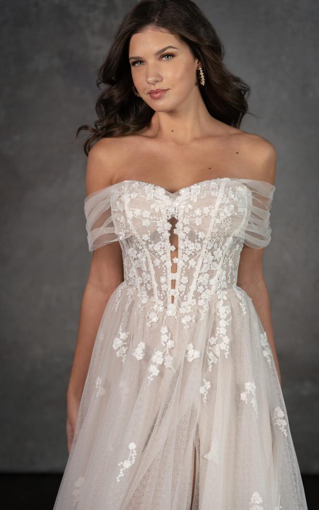 The sweetheart neckline beautifully complemented by delicate lace and a soft French tulle wrap, creating a look that’s both sophisticated and romantic. Intricate matte lace appliques and subtle shimmering sequins bring the design to life, adding dimension and allure.