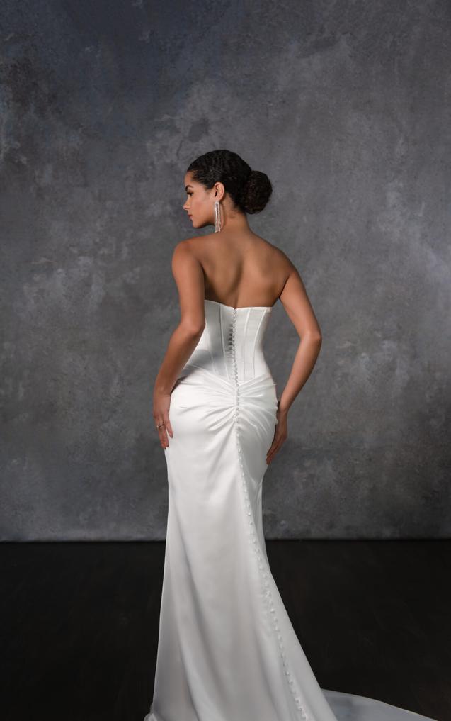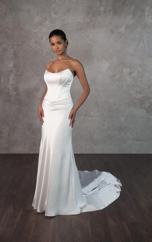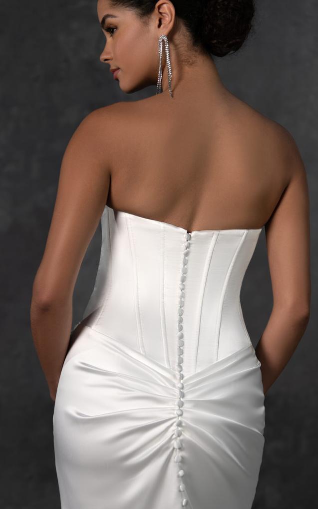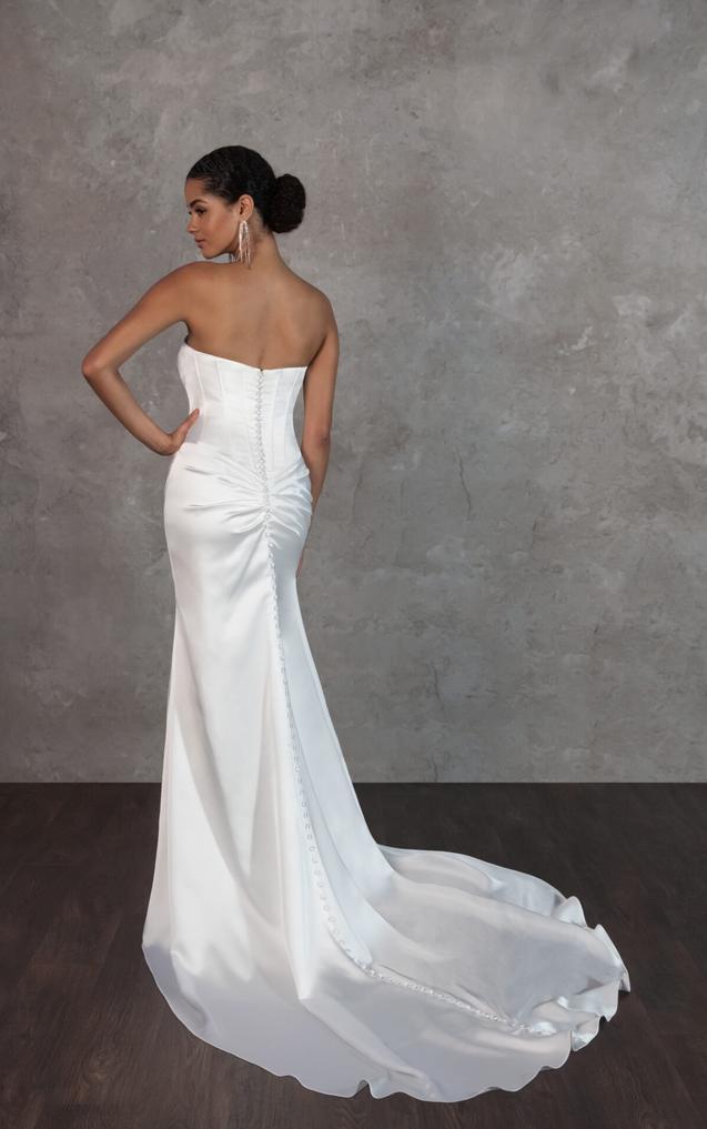 The strapless scooped neckline introduces a structured bodice, featuring flattering exposed boning for a refined, figure-enhancing effect. From the drop waist, a slinky column skirt skims effortlessly over the body.