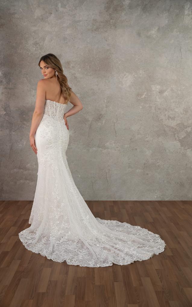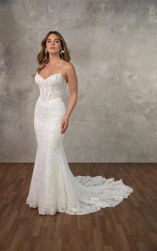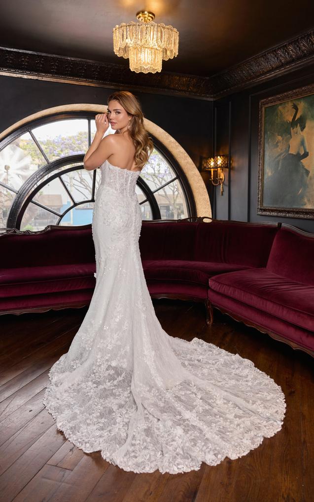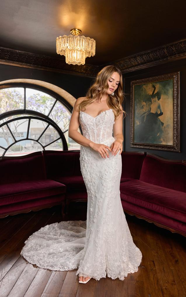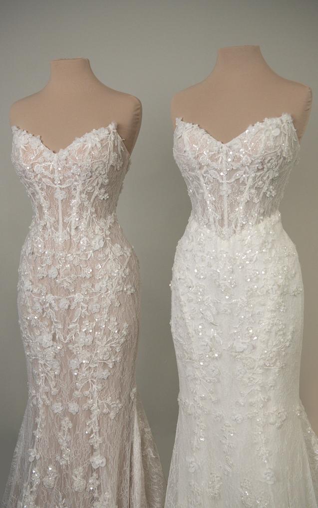 (COMING SOON!) (Bodice Unlined or Lined) Crafted from allover ivory beaded lace layered over soft tulle, this gown features a striking cat-eye neckline that adds modern edge to the classic strapless silhouette. Meanwhile, the exposed boning shapes the structured bodice, while 3D floral lace appliqués add texture and complexity across the figure-hugging design.
