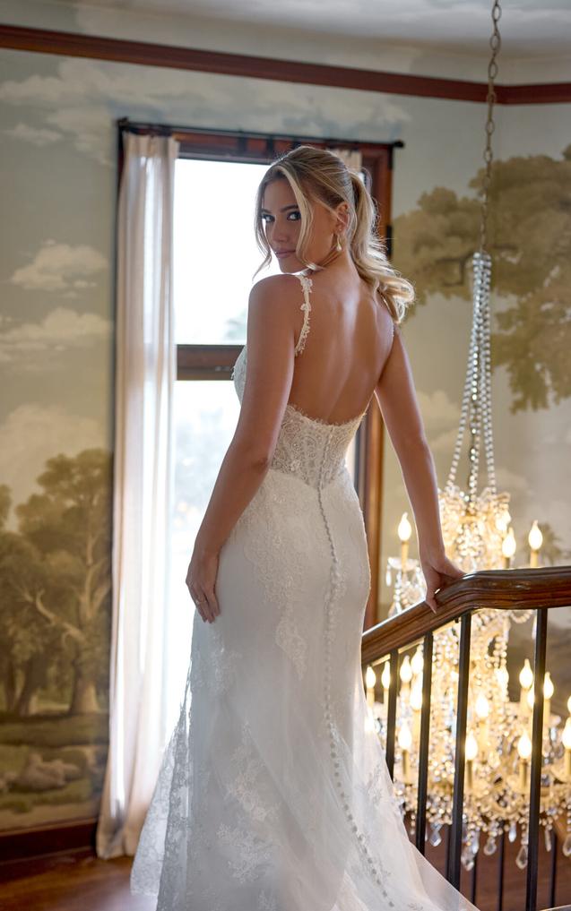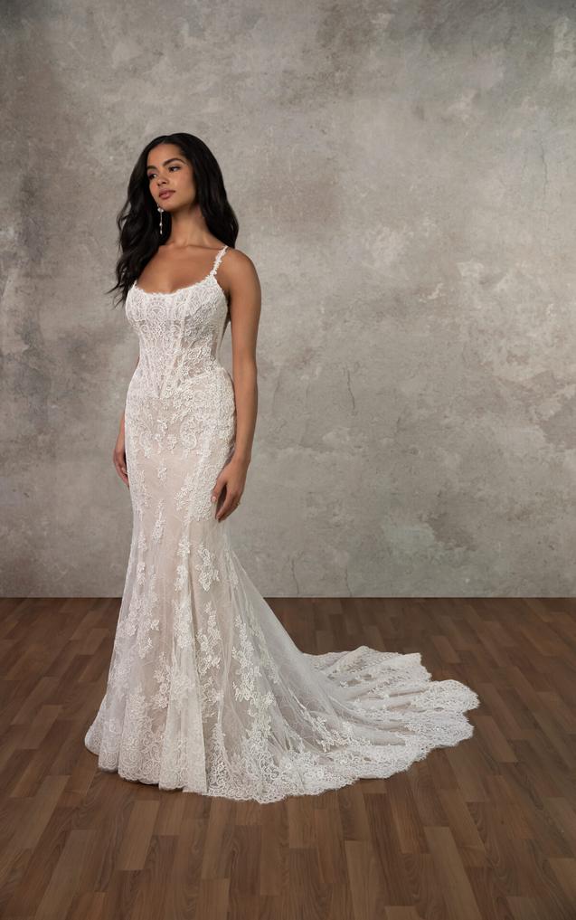 (COMING SOON!) Crafted in lace and tulle, this fit-and-flare gown features a soft scooped neckline with lace-shaped straps and a structured bodice with corset boning for subtle definition. A delicate Chantilly lace underlay adds texture beneath matte floral lace appliqués, while the Basque waist elongates the frame with a nod to classic design.