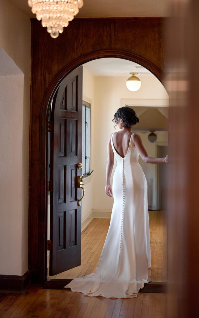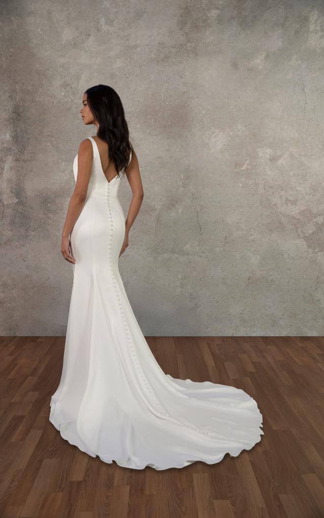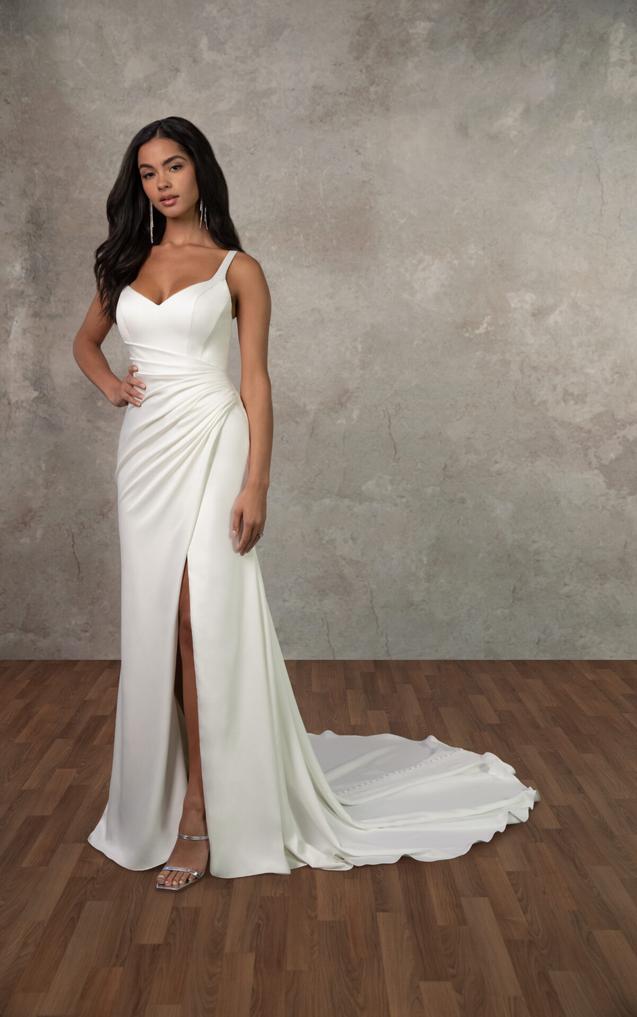 (Slit or No Slit) The modified sweetheart neckline and delicate straps frame the bodice, while asymmetrical pleating and princess seams add texture and shape across the torso. A high leg slit offers ease of movement, balanced by the clean, elongating lines of the sheath silhouette. The look is finished with a V-back and fabric-covered buttons that trail down to the hem.