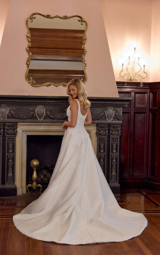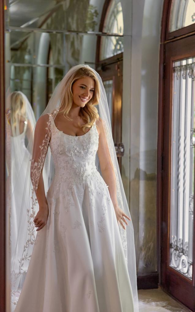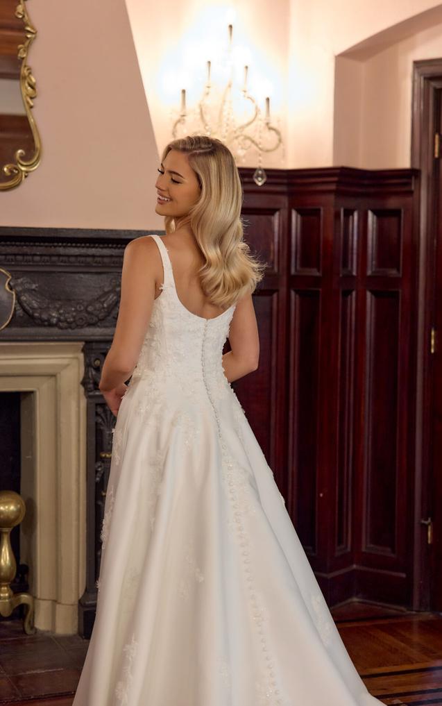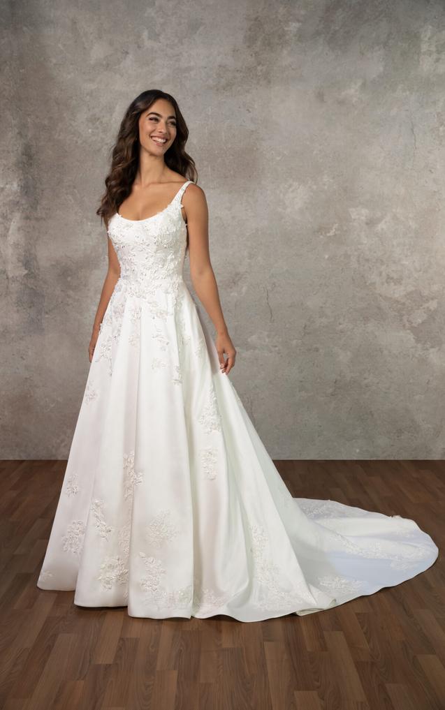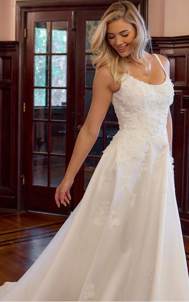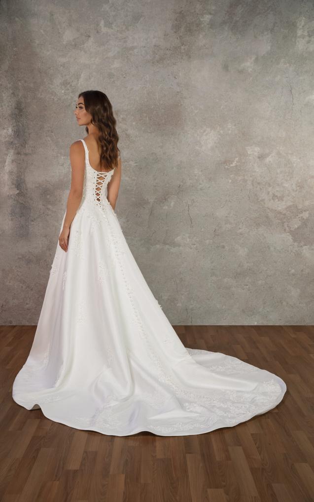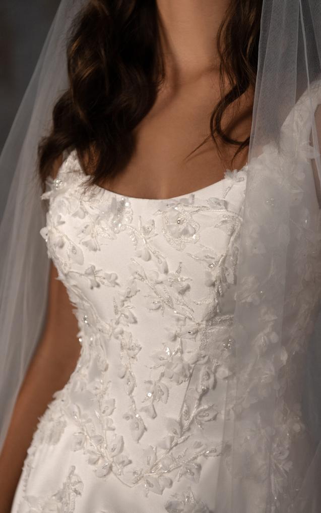 (COMING SOON!) Wide shoulder straps frame a modern scoop neckline and a flawlessly structutred bodice embellished with 3D floral lace appliqués, adding texture and depth to the clean design. In the back, a graceful scoop back highlights a tie-up back that extends into a row of fabric covered buttoms.