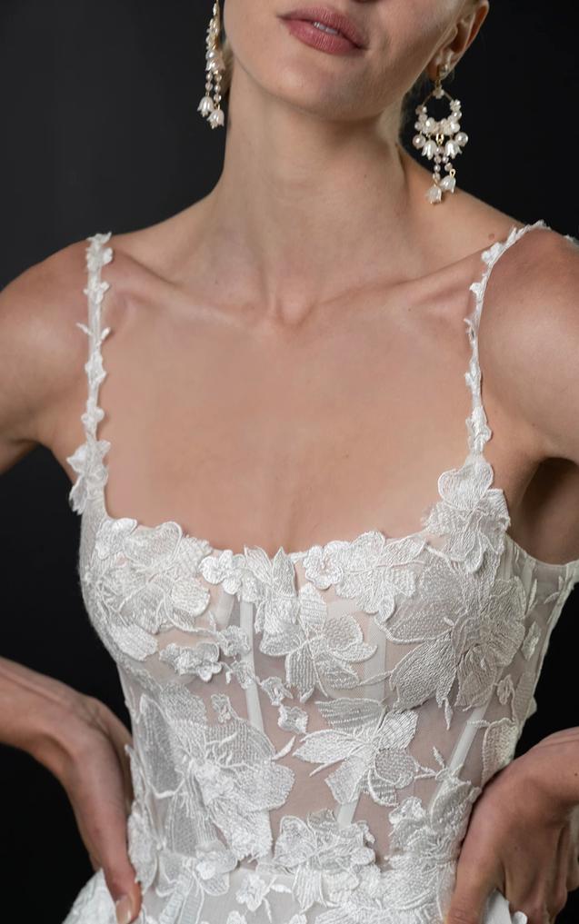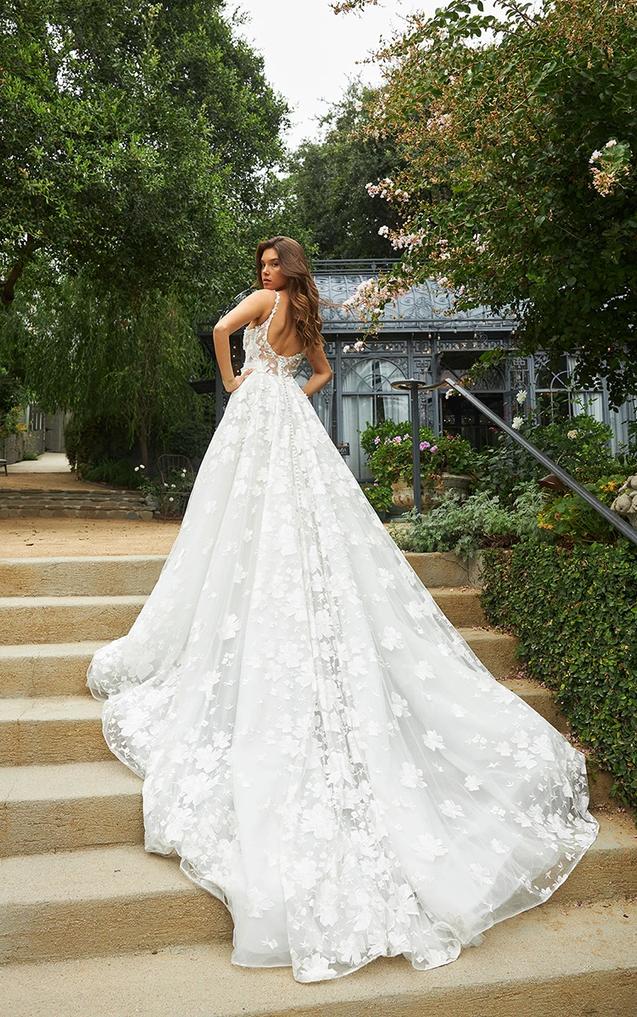The semi-sheer bustier bodice accentuates the figure and complements a low scooped sheer lace back detail. In luxe layers of lace, tulle and royal organza, this captivating wedding dress softly drapes into a full ballgown skirt.
