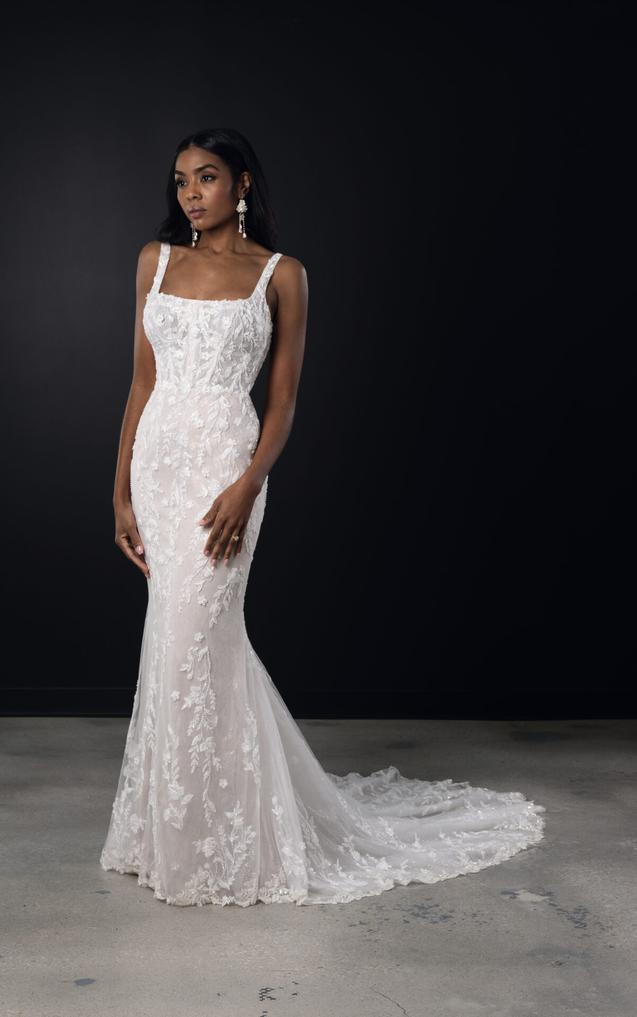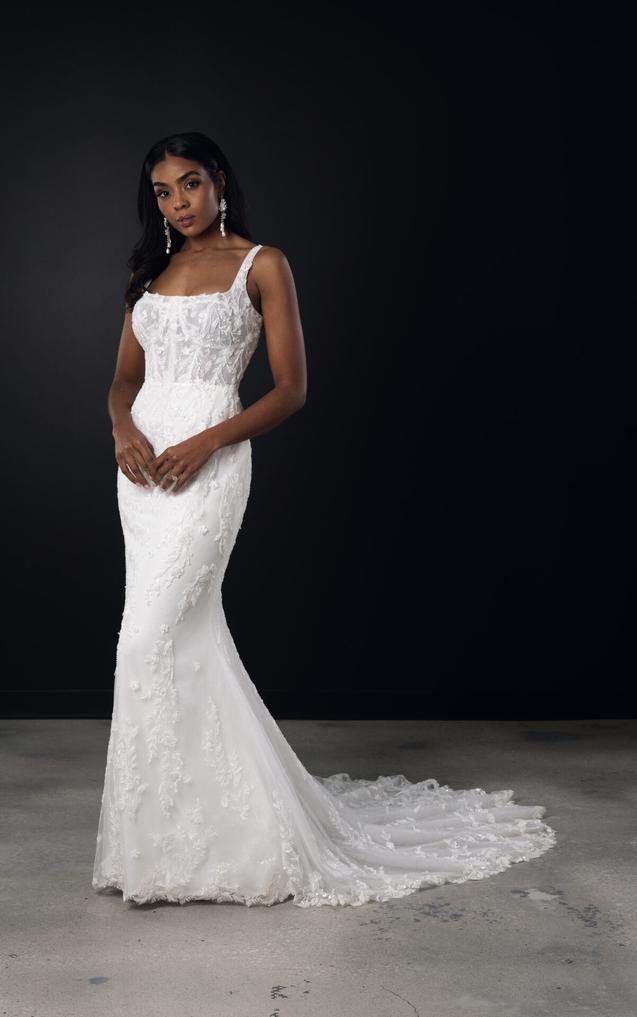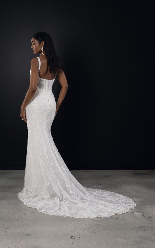 The chic straps on this gown grace the shoulder to meet the elegant square neckline of a semi-sheer bustier corset bodice. Floral lace is embellished with exquisite beaded and sequin accents, then scattered all over the lace and glitter tulle bridal gown, meeting a row of crystal buttons in the back.