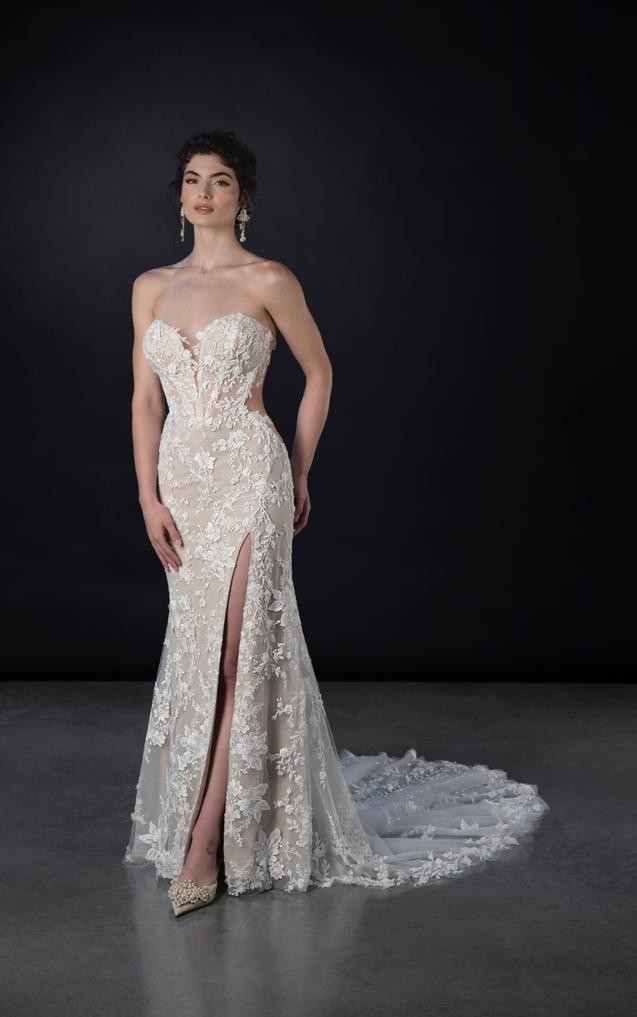 This gown features a plunging sweetheart neckline atop a fitted corset bodice with exposed boning and daring side cutouts, accentuating the natural hourglass figure. A gown-length row of fabric-covered buttons trails the back, while the sparkling column skirt skims every curve, offering an optional high leg slit for added allure.