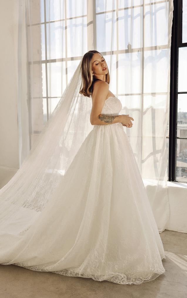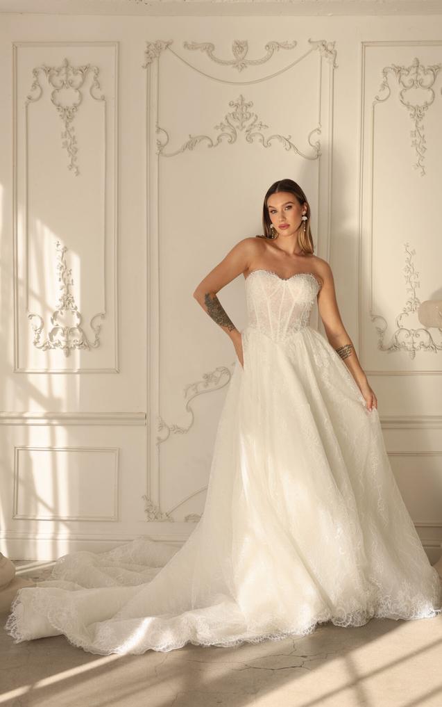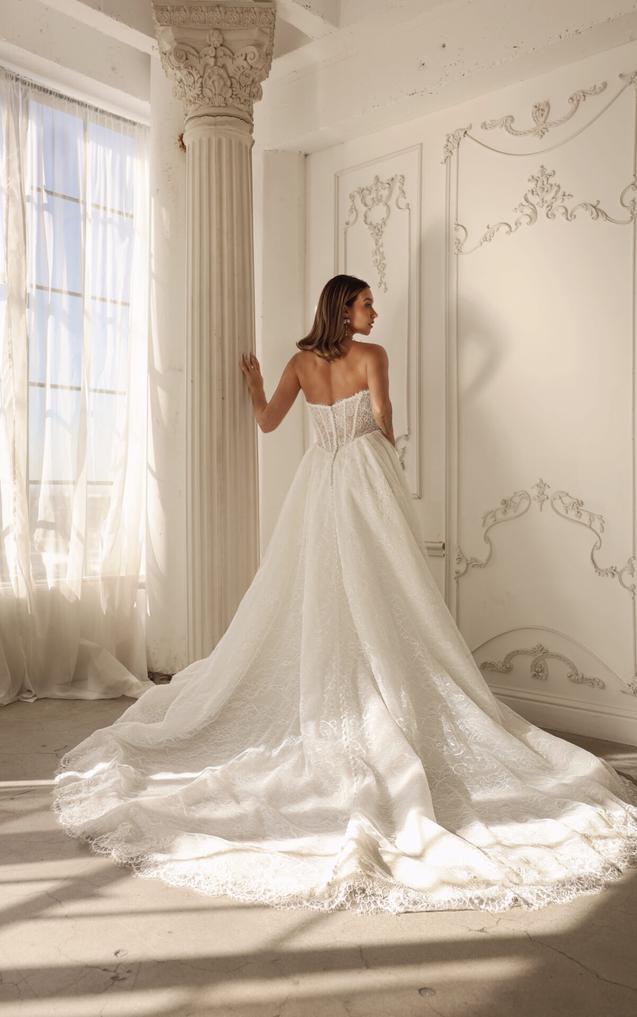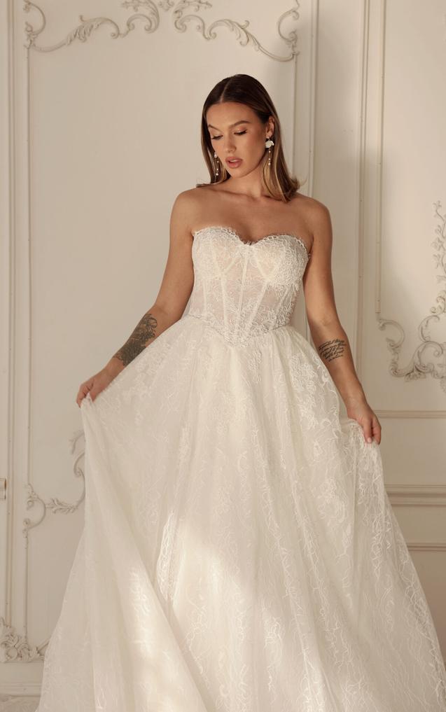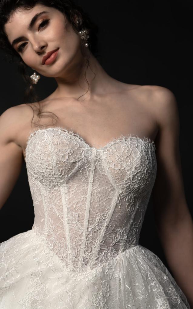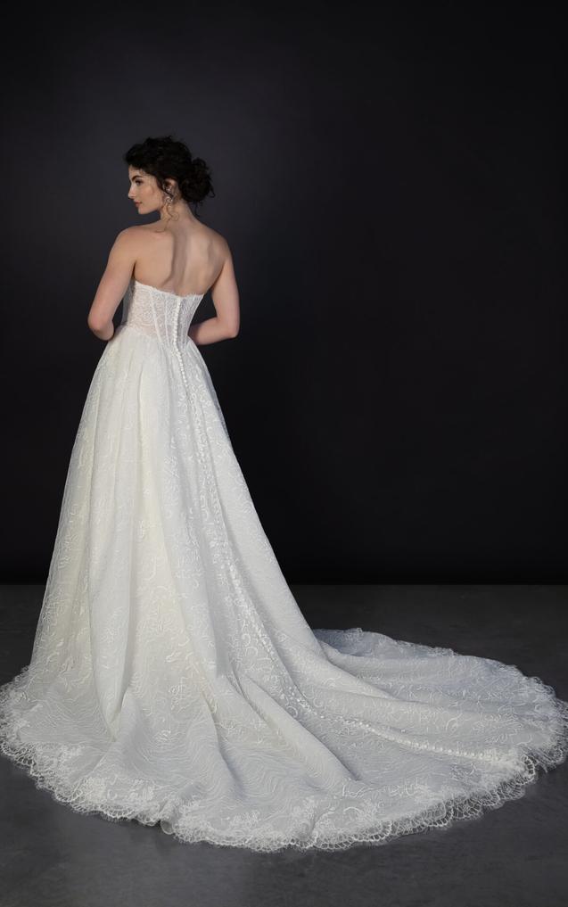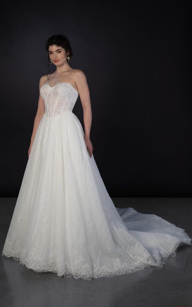 (Bodice Unlined or Lined) This sweetheart neckline wedding dress is enhanced by exposed corset boning, giving the bodice a fitted and structured look that’s available with a lined or unlined option for the bride’s desired level of sheerness.