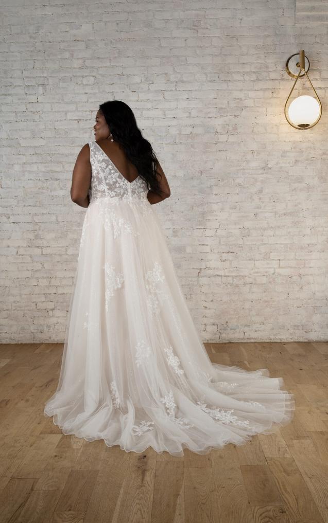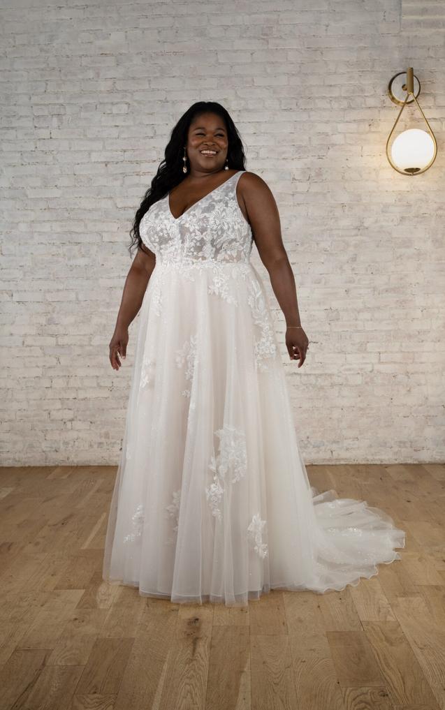 (Unlined or Lined Bodice) This flattering A-line wedding dress begins with graceful shoulder straps that dip into a deep V-neckline. The embellished bodice comes lined or unlined for a sheer option to reveal the impeccable fitted construction and hint of skin beneath.