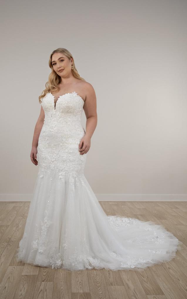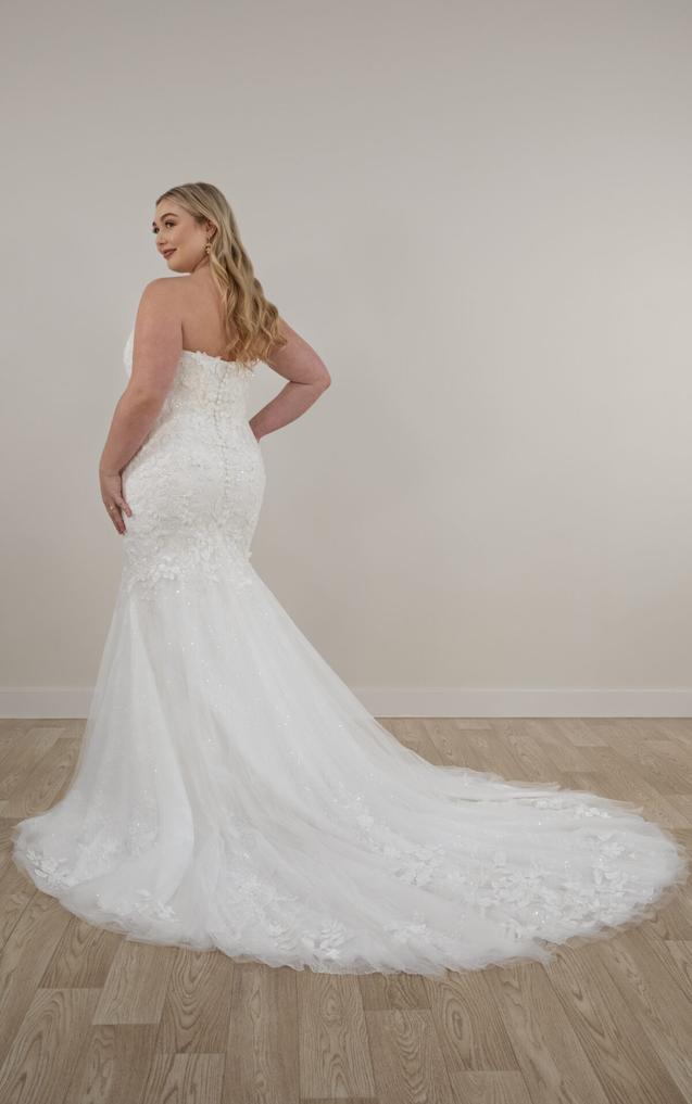 This gown features a strapless sweetheart neckline with a modest plunge lined in illusion tulle. Dazzling floral lace appliqués and 3D floral accents embellish this sparkling gown through the hips to meet a sea of voluminous layers in sparkle tulle before cascading into a sweeping lace-accented train.