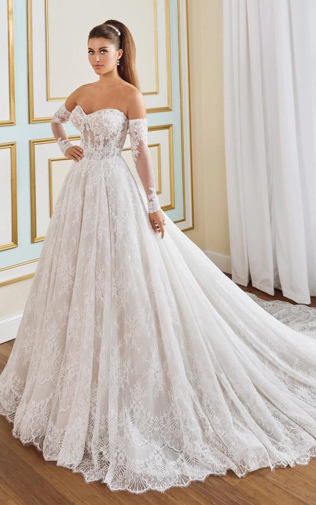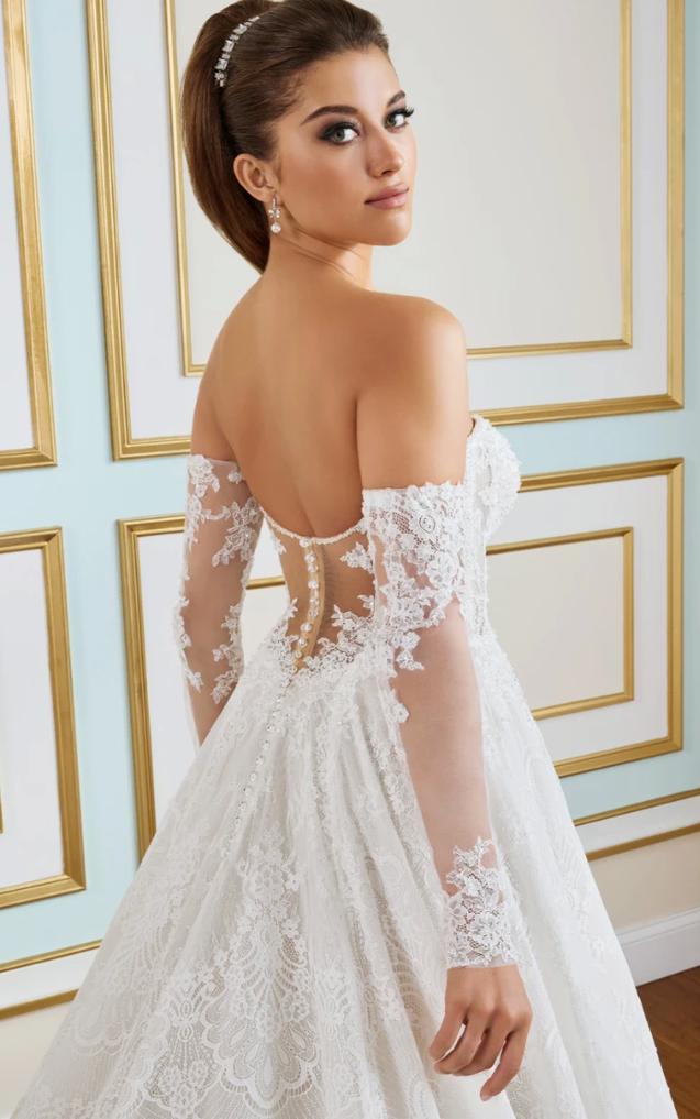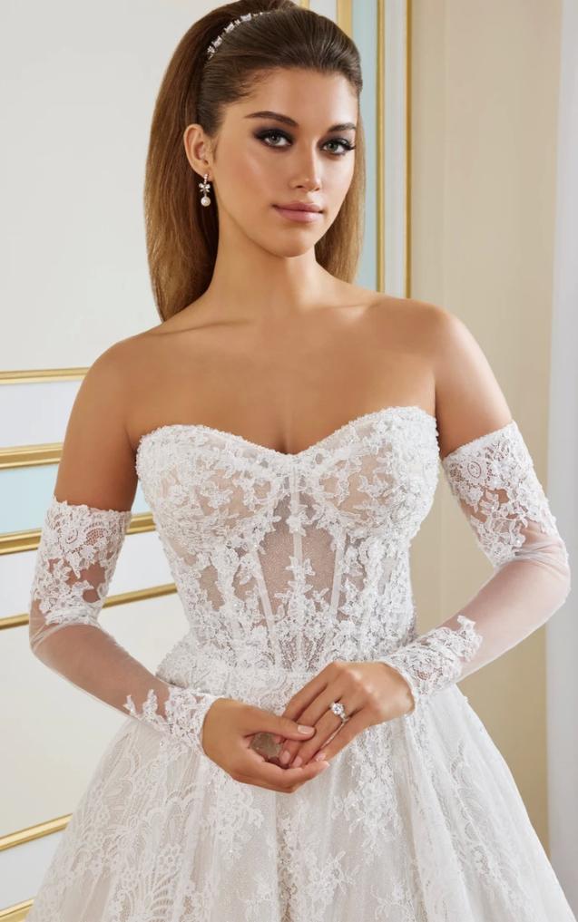 This breathtaking A-line gown shimmers with layers of glitter tulle and delicate sequins, adding a perfect touch of sparkle to every step. The flattering sweetheart neckline beautifully frames your décolletage, while thoughtful corset detailing at the waist enhances your natural curves. (Long Sleeves Inlcuded)