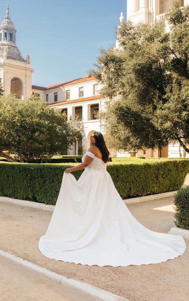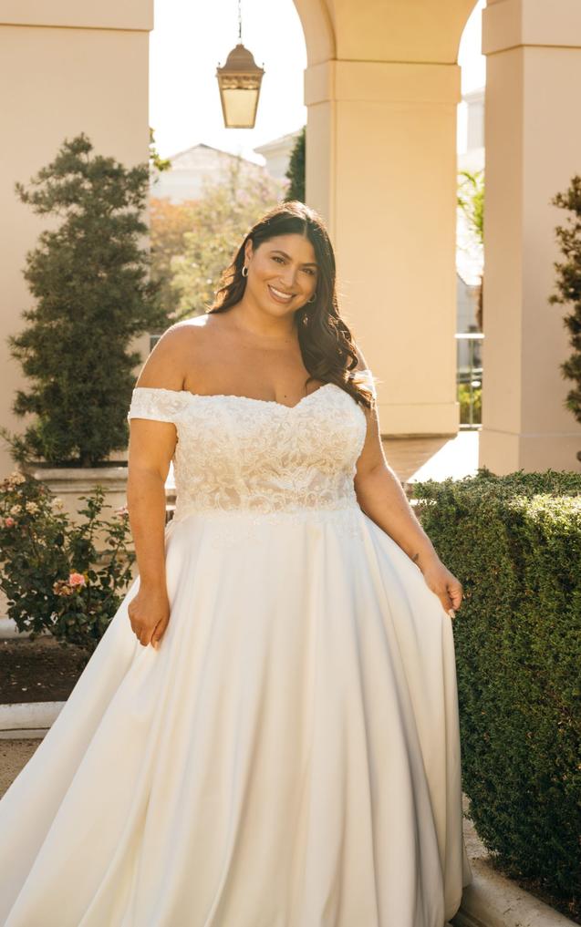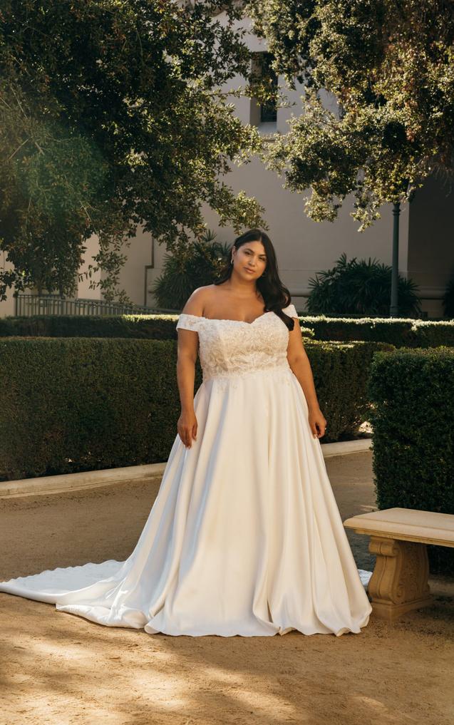 (Unlined or Lined Bodice) This gown features a timeless sweetheart neckline that extends to delicate off-the-shoulder lace straps to match the sheer bodice. From the natural waist, Mikado fabric dramatically drapes to form a full and voluminous ballgown skirt with beaded lace detailing the train.
