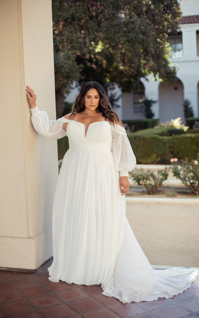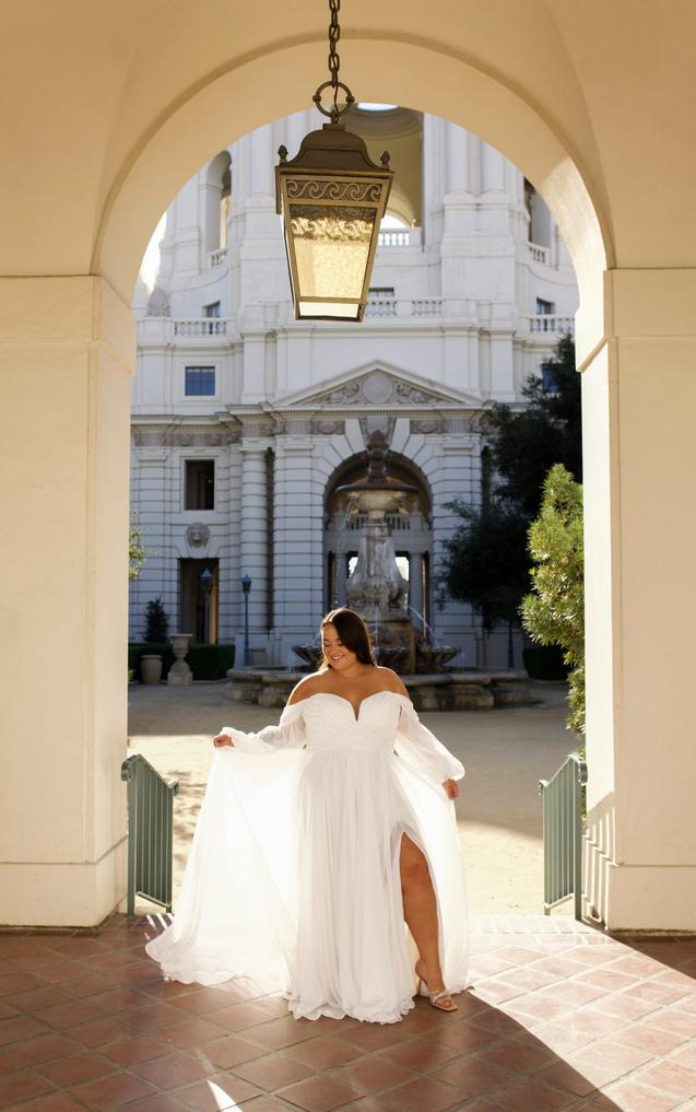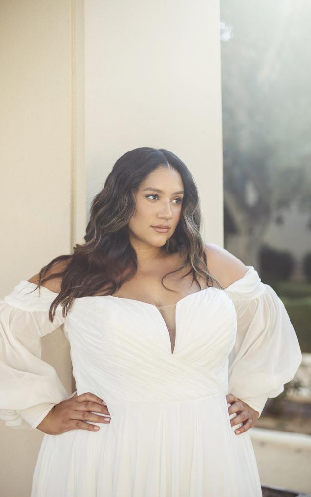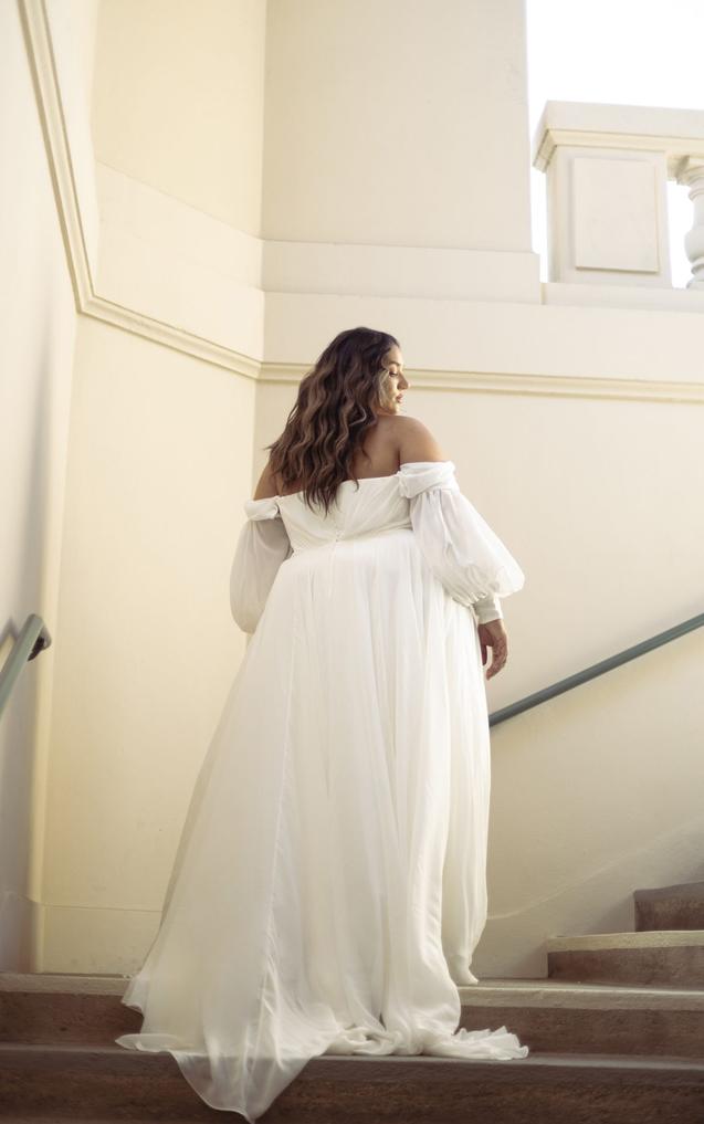 The notched plunging neckline accentuates the soft pleating of the romantic wrapped bodice, while the detachable off-the-shoulder blouson sleeves add a luxe detail.The clean and simple aesthetic is made complete with a soft A-line skirt that floats and sways with every movement, with a side slit detail and beautiful train.
