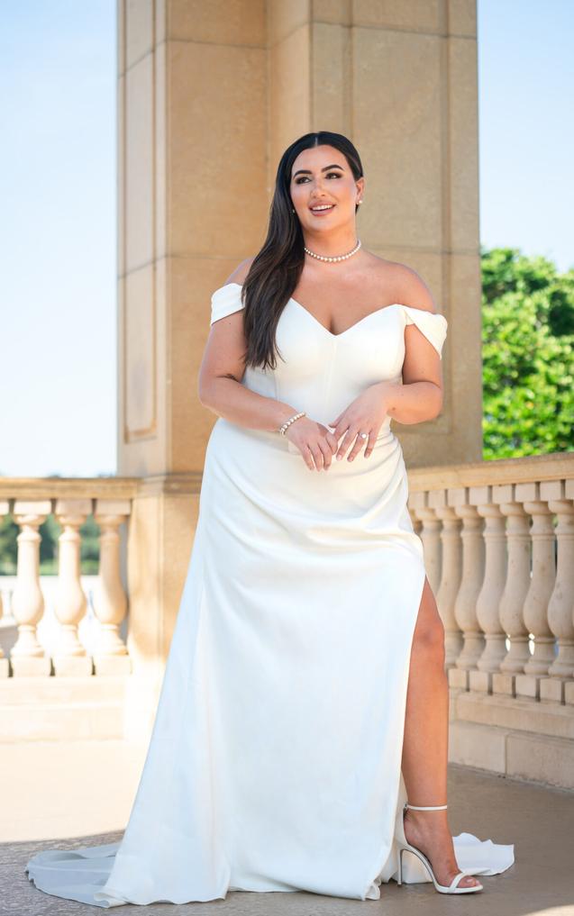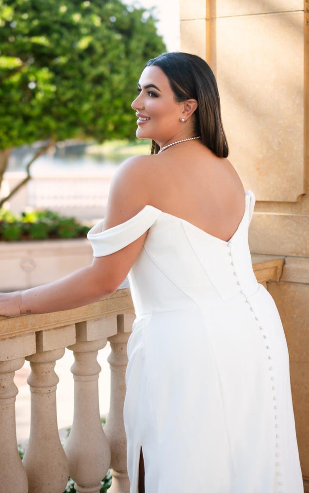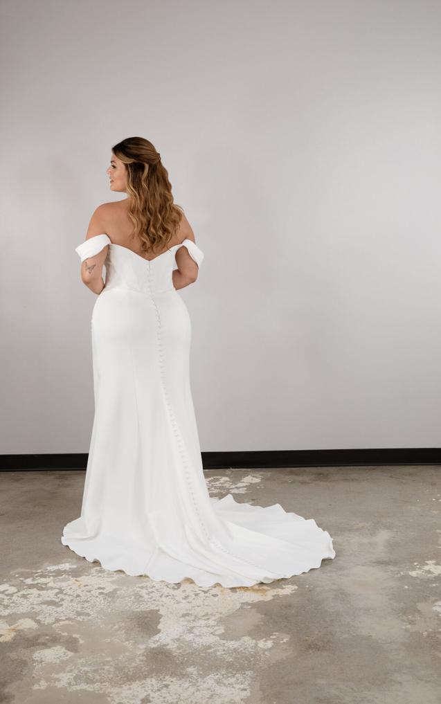(Available with or without a slit) Detachable off-the-shoulder straps connect to a flattering sweetheart neckline in luxurious stretch crepe, adding an element of sophistication to the contemporary structured bodice. Highlighting the figure in this classic column silhouette, an optional high leg slit adds a touch of drama.