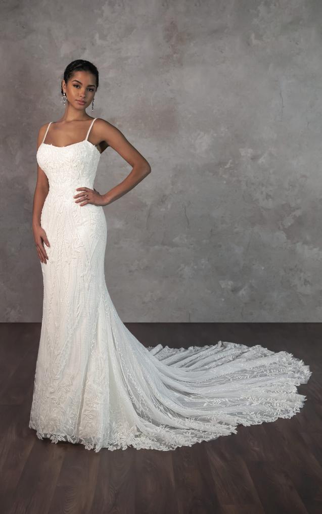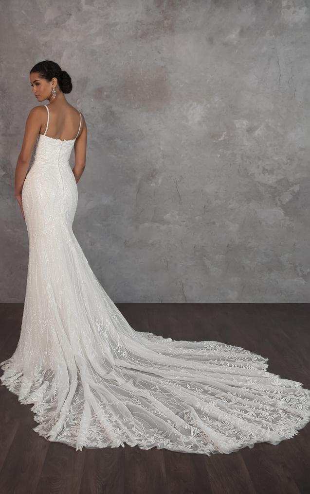 Sleek beaded spaghetti straps frame a delicate scoop neckline, leading to a bodice adorned with intricate 3D vine and lace appliques. The allover lace design cascades seamlessly into a fitted silhouette, flaring just above the knee for a graceful, ethereal effect.