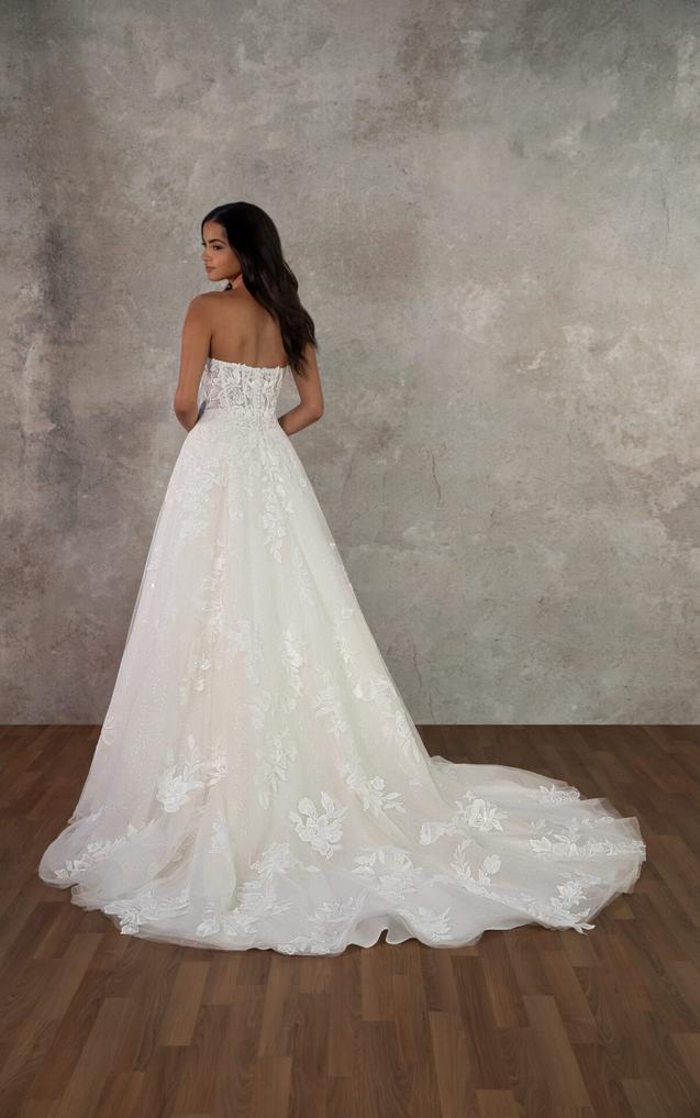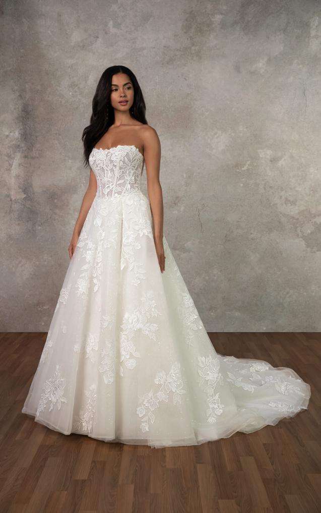 (COMING SOON!) (Bodice Unlined or Lined) The strapless sweetheart neckline frames a delicately structured bodice, available lined or unlined, features exposed corset boning and layers of sequined leafy lace for allover sparkle. Gently dropping at the waist, the silhouette elongates the figure before cascading into a voluminous tulle skirt.