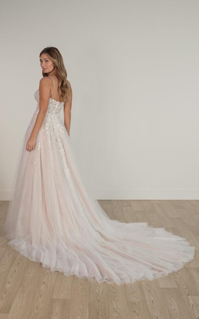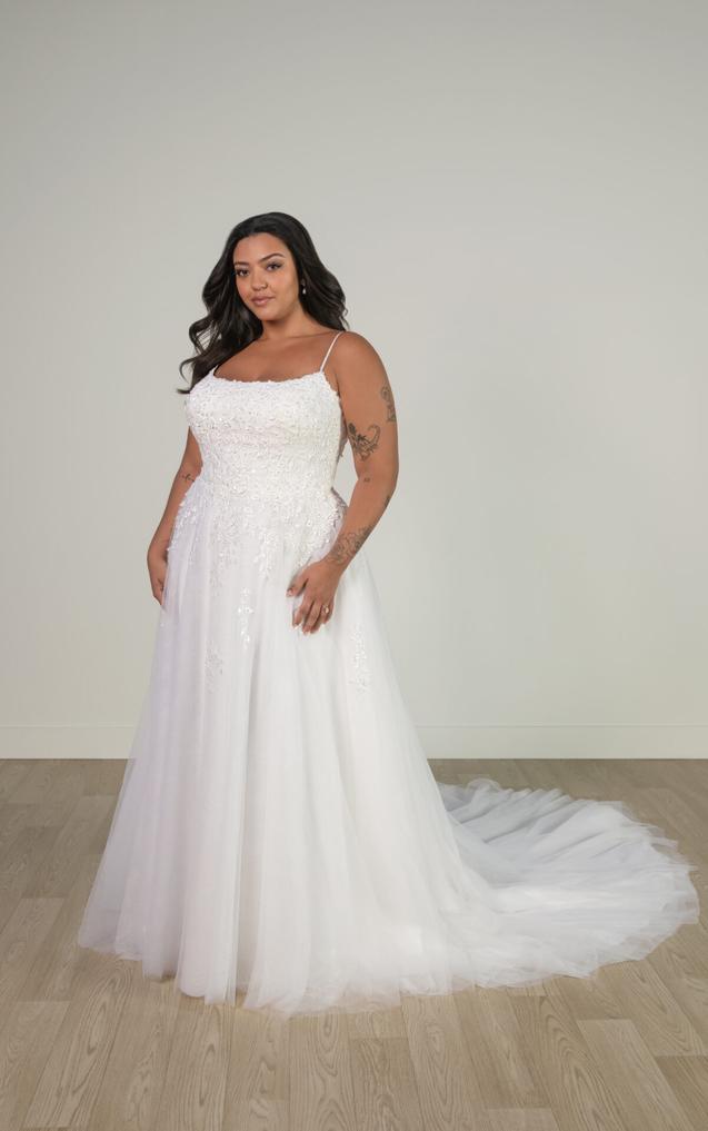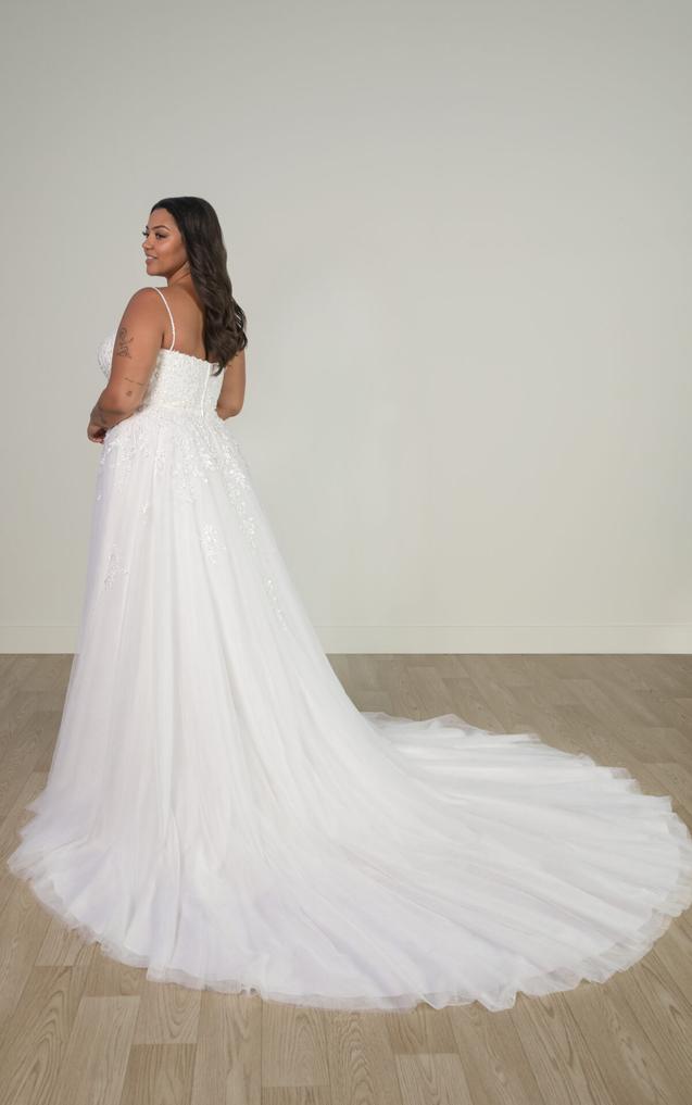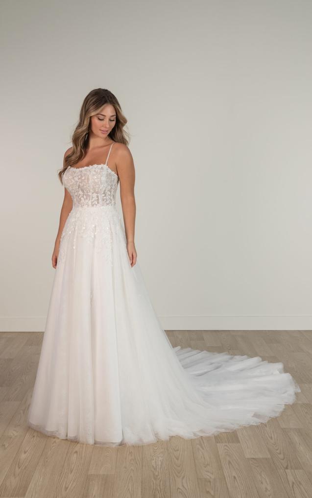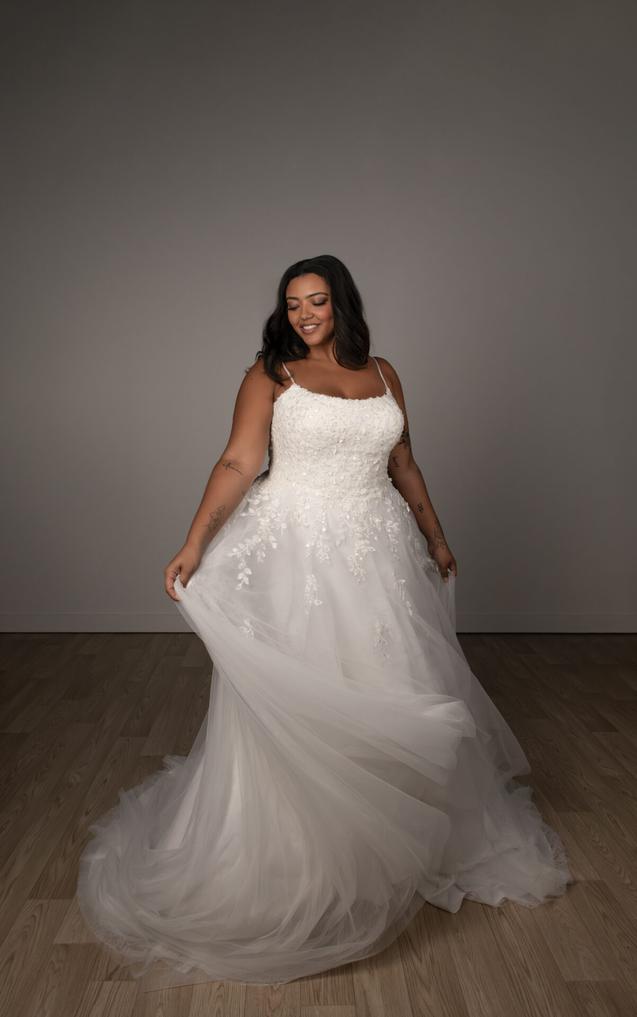 (Bodice Unlined or Lined) This enchanting lace and tulle wedding gown features a soft A-line silhouette, beautifully adorned with delicate, nature-inspired lace for a whimsical, ethereal look. Beaded spaghetti straps frame a flattering square neckline, leading to a sheer bodice detailed with intricate 3D lace.