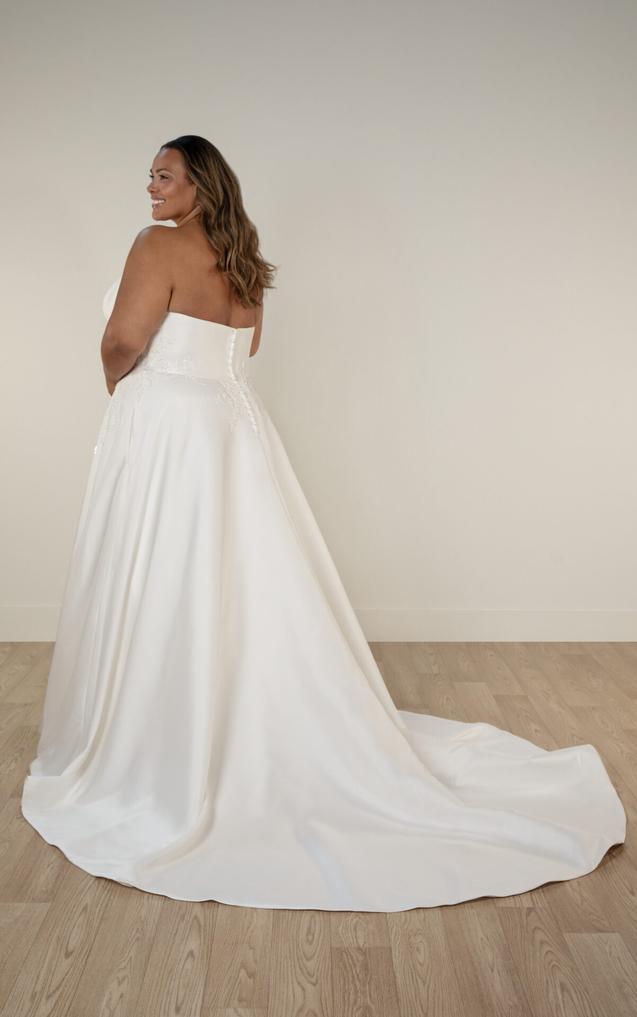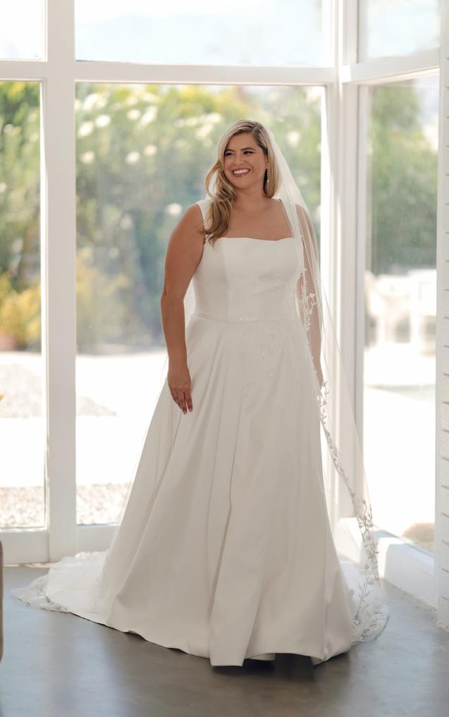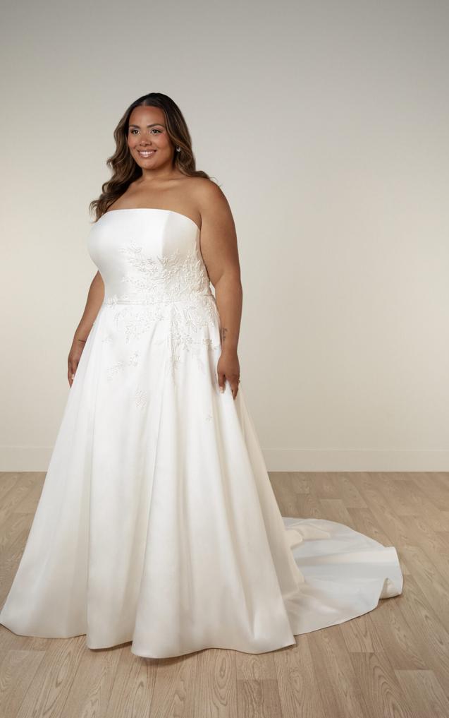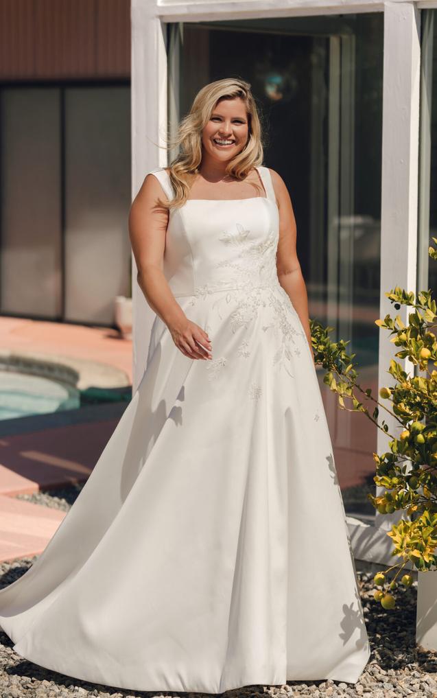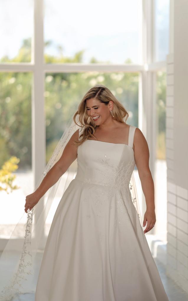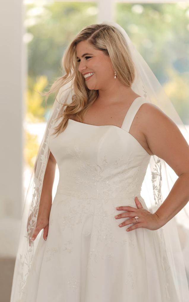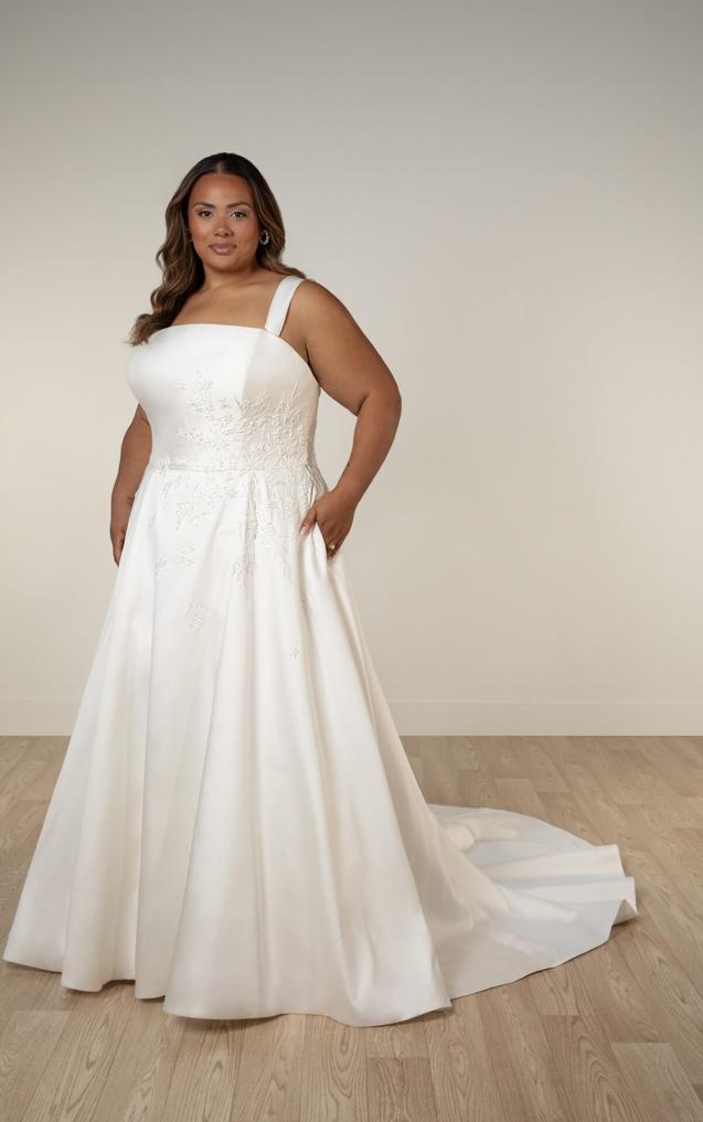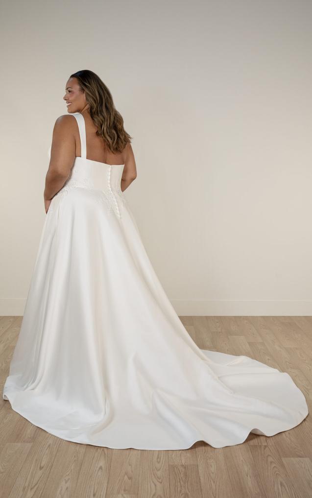 The bodice features a straight-across neckline enhanced by thick detachable straps that create a contemporary square neckline, elegantly framing the upper silhouette. Subtle stitched floral motifs adorn the bodice, wrapping around the back and softly flowing onto the skirt.