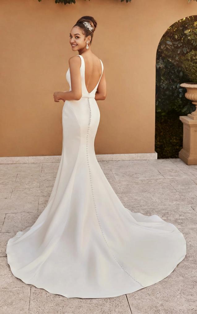 The sheer side panels of the bodice shows a hint of skin and so does the skirt which drapes perfectly down the body and into a flattering fit-and-flare silhouette with a modest skirt split. The back of this gorgeous wedding dress features a deep-V back adorned with fabric covered buttons.