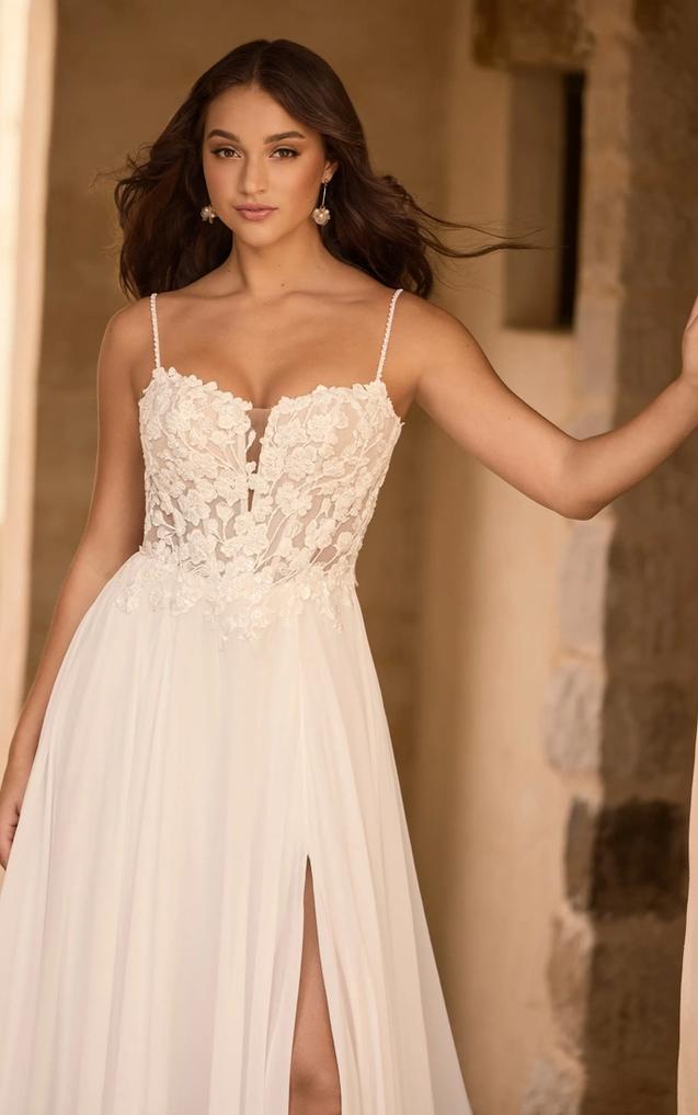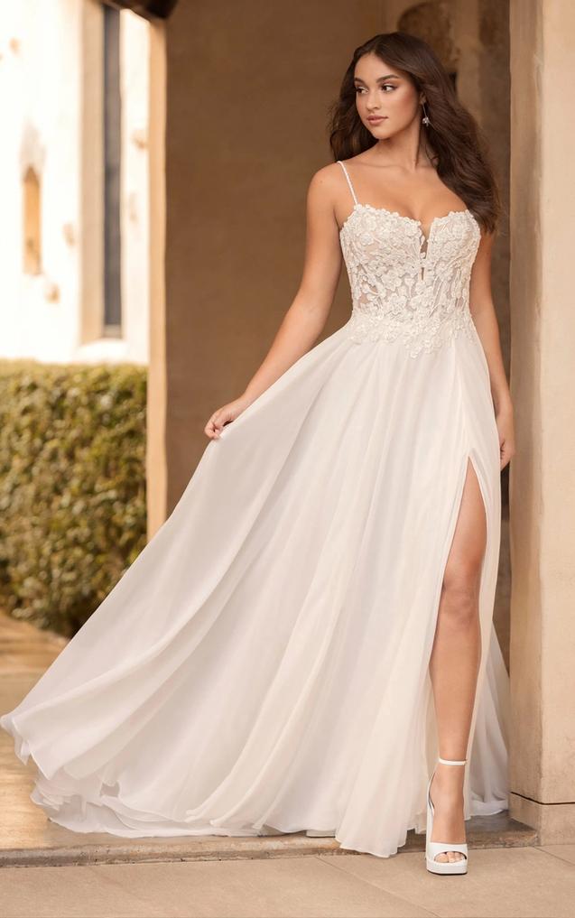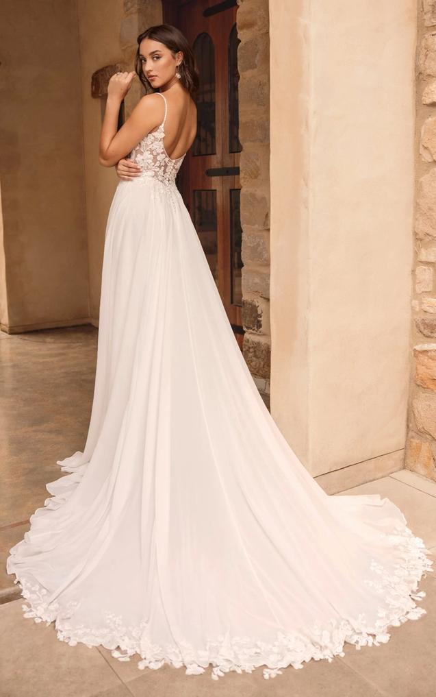 This soft chiffon A-line gown is not only easy to move in, but she also is ultra-flattering, feels gentle on the skin, and flows behind one ever so gracefully. Caitlin's scoop neckline delicately frames one's decollétage and her sexy peekaboo allows for a touch of modern allure.