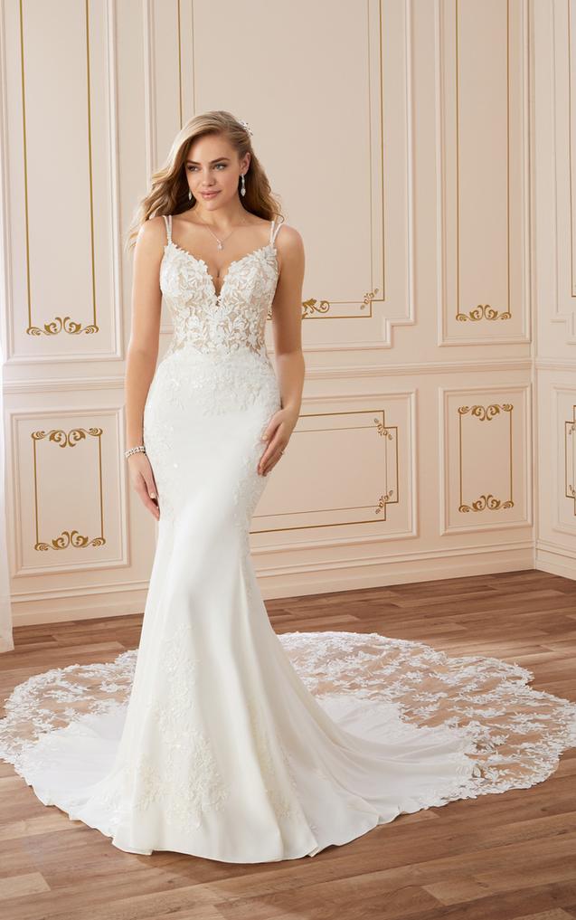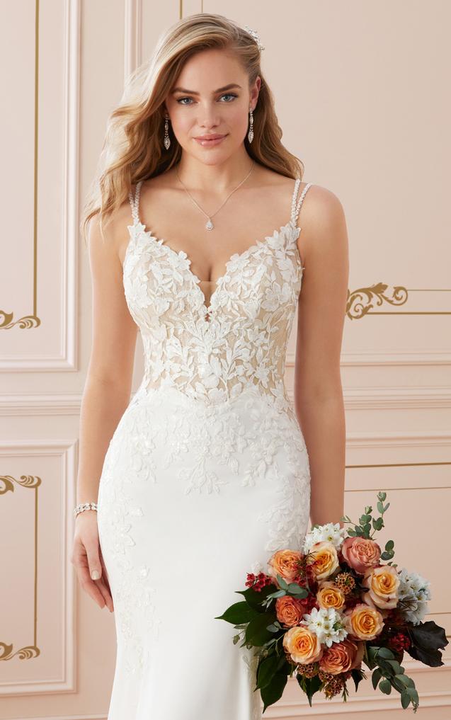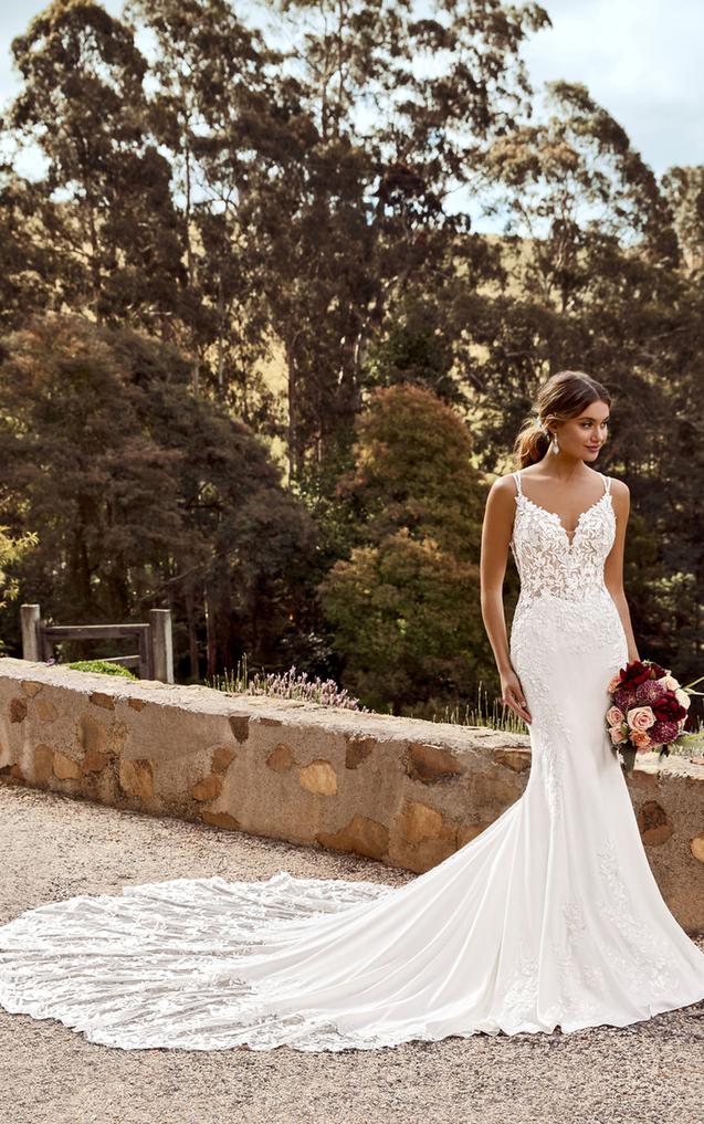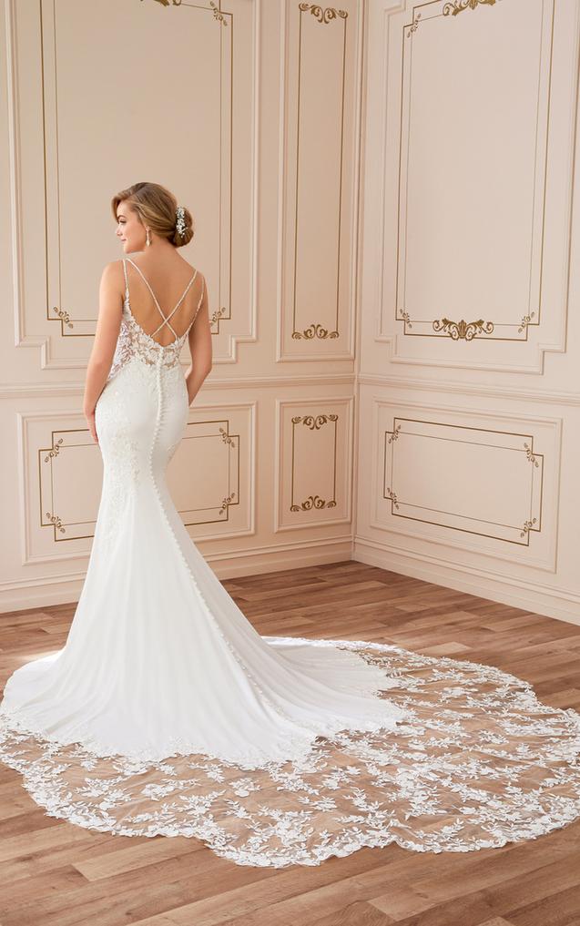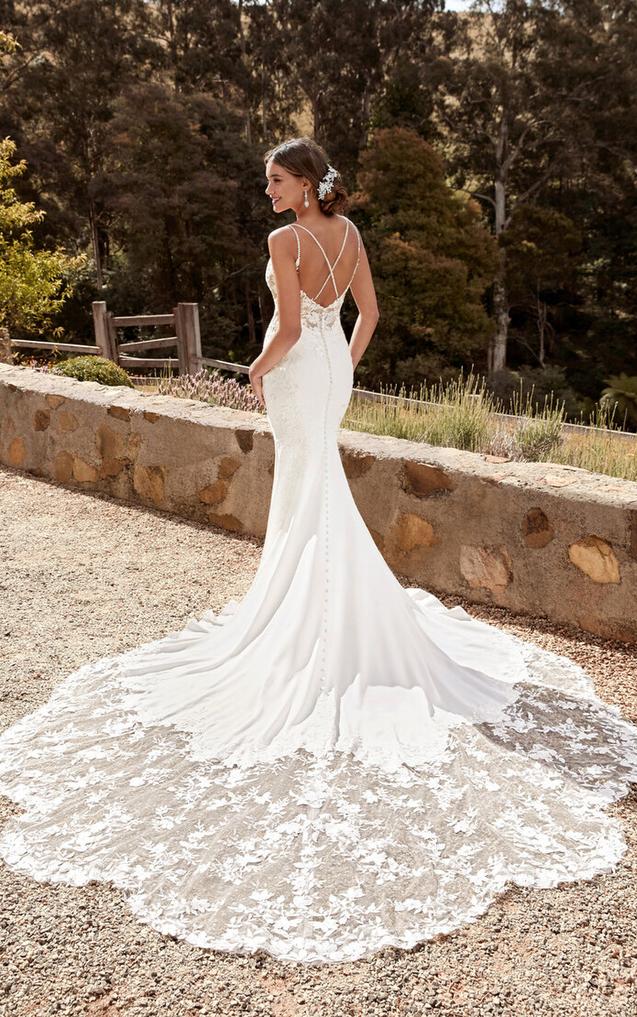 This gown features a combination of Chantilly lace and floral lace appliqués over crepe witha semi-sheer bodice. Exquisite hand beading gives the flattering V-neckline a stunning sparkle, leading into double beaded spaghetti straps which criss-cross at the back for a modern twist. The perfect finishing touch - and the highlight of this gown - is the laser cut petal-shaped lace train.