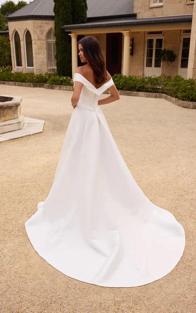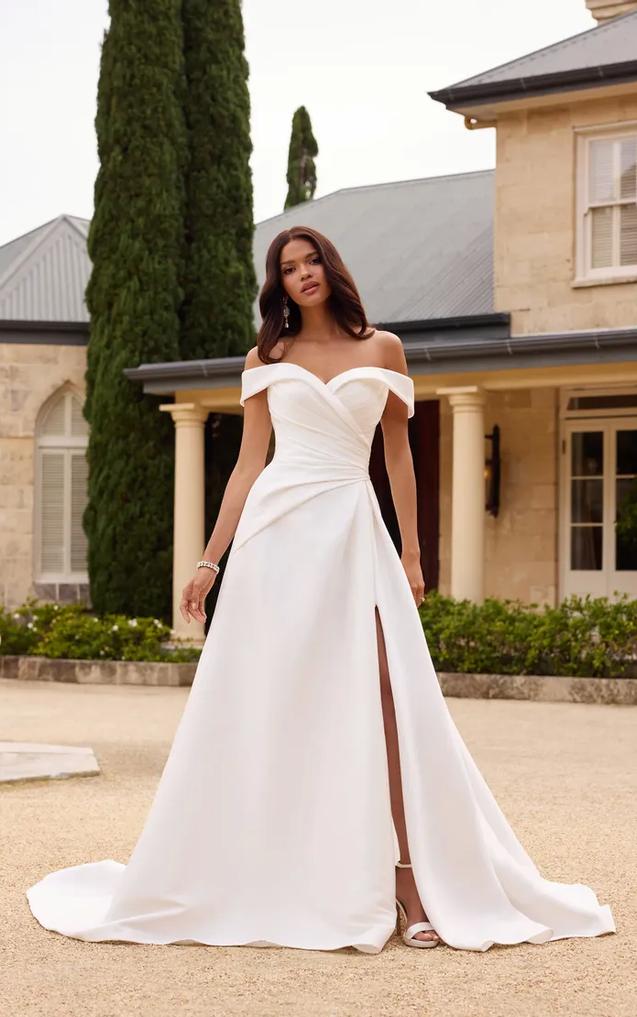 Crafted entirely from luxurious pearl mikado, Chandra's sweetheart bodice features delicate draping and elegant off-shoulder straps which make this silhouette universally flattering. The grand ball gown skirt is elevated with a sexy split, bringing a touch of drama to your minimalist bridal look.