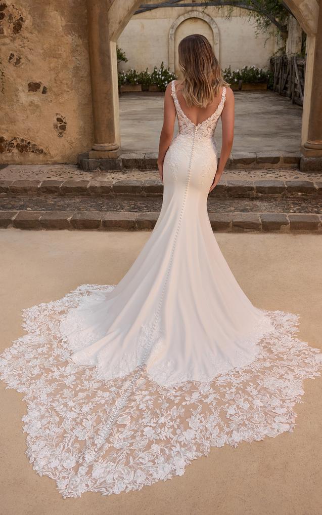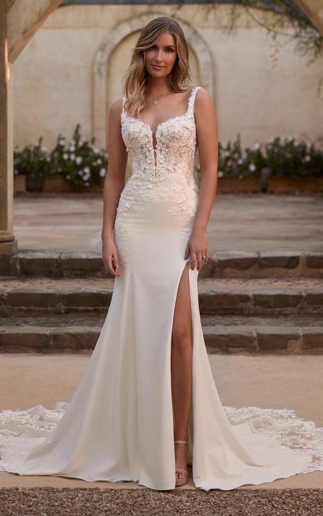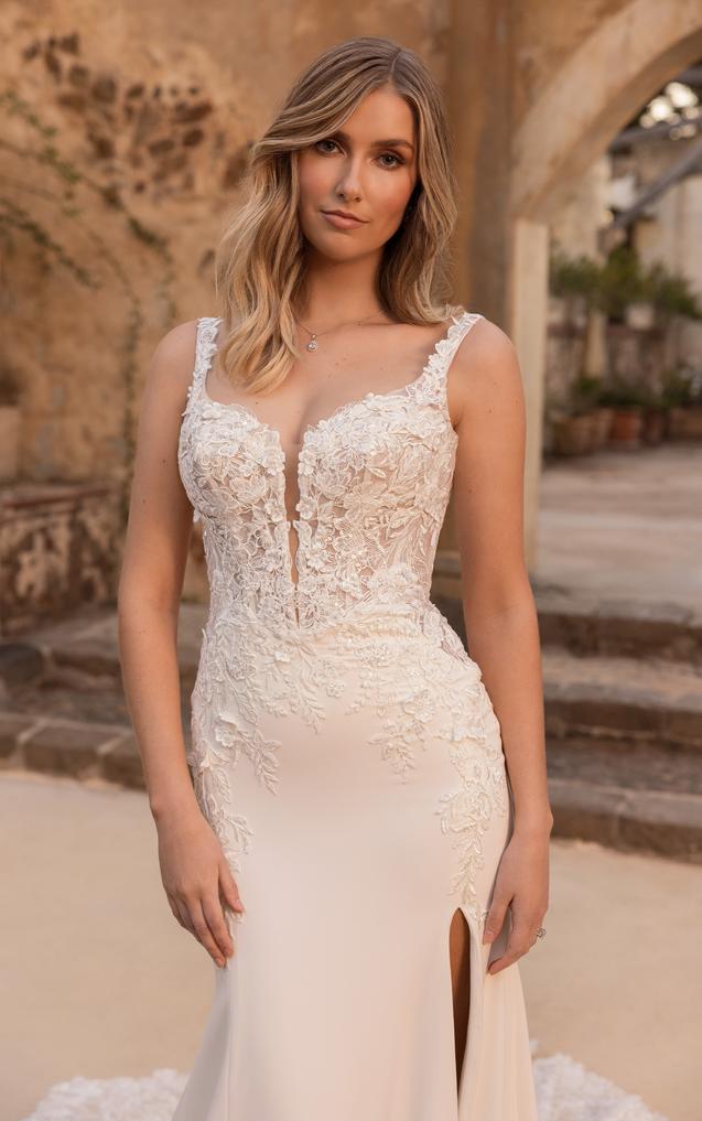 The plunging V-neckline compliments the structured bodice on this gown, featuring delicate beaded lace appliqués. Elegantly crafted from tulle, royal crepe and stretch jersey, this wedding gown is both stylish and sexy, while also ensuring you can move freely on your special day.