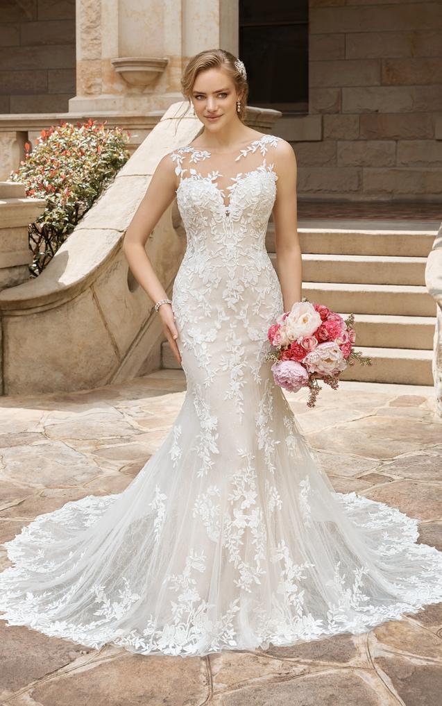 Soft allover Chantilly lace pairs effortlessly with floral-inspired lace appliqués to create a fit and flare silhouette that hugs your curves in all the right places. Add drama with the detachable overskirt. (Detachable Skirt Sold Separately)