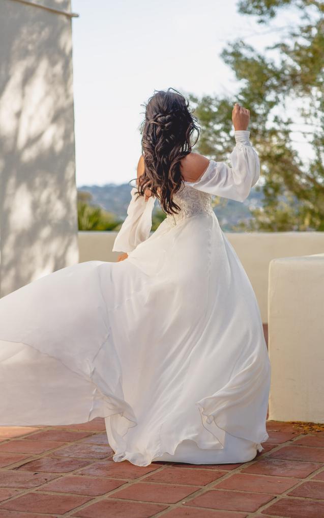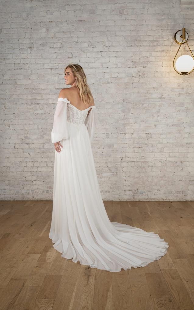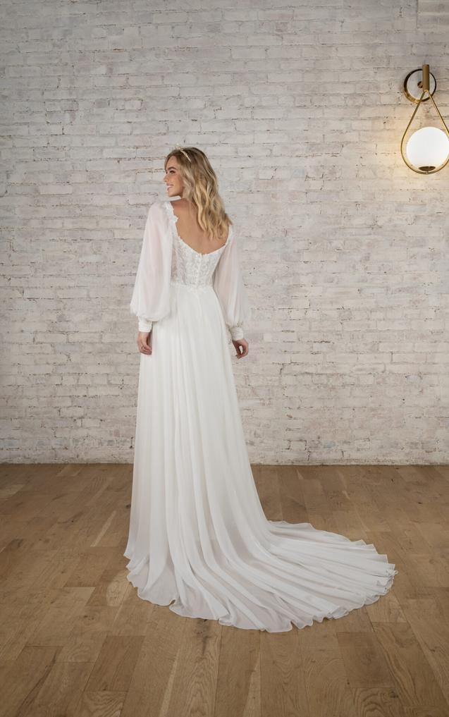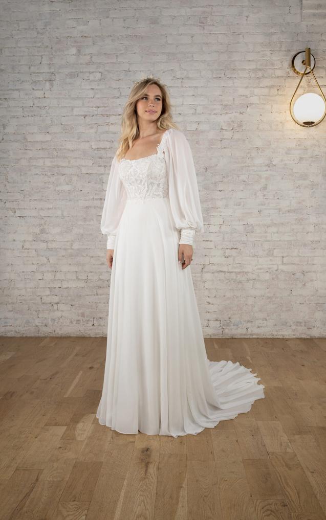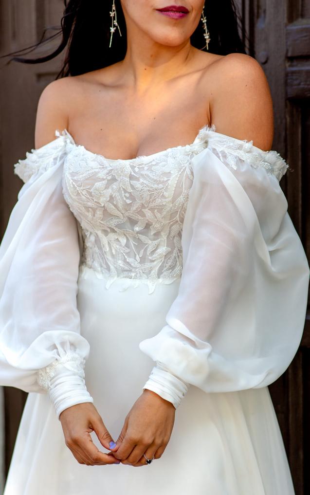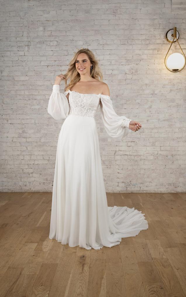 This dreamy soft A-line wedding dress in lace and cotton chiffon brings an element of timeless romance to that special day. The detachable long blouson sleeves can be worn on or off-the-shoulder, attaching at the softly scooped neckline and cuffing at the wrist with a subtle row of fabric-covered buttons.