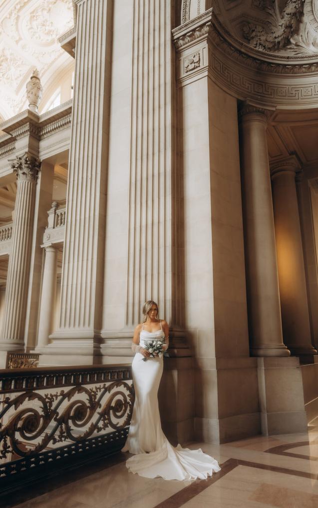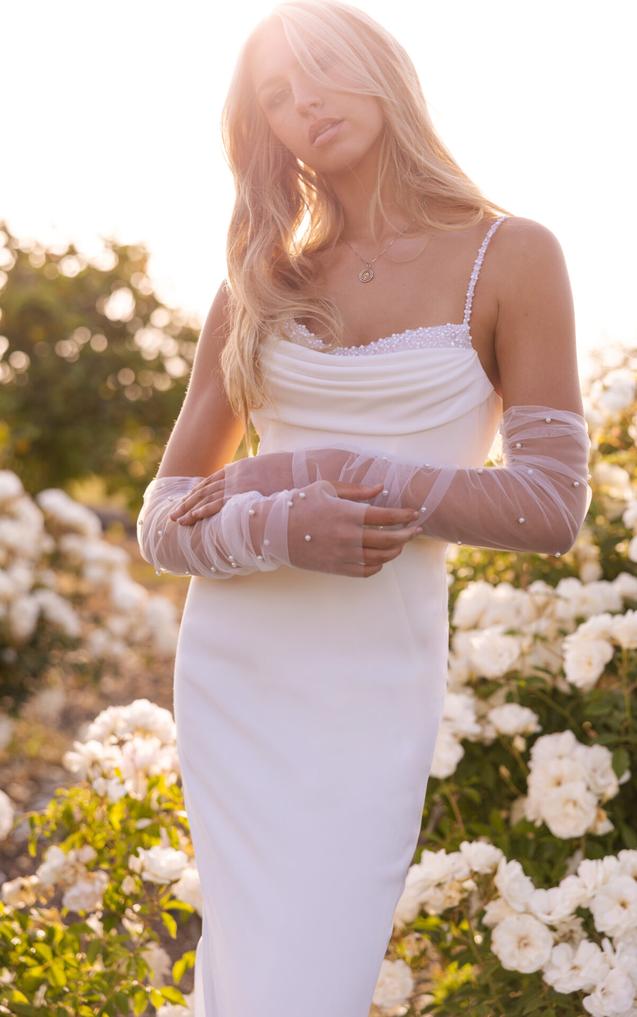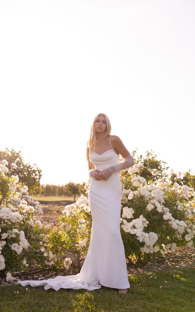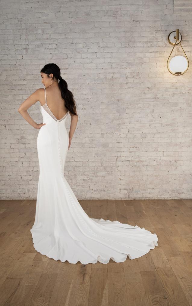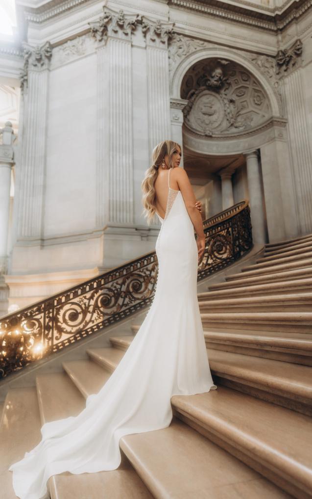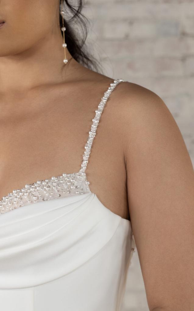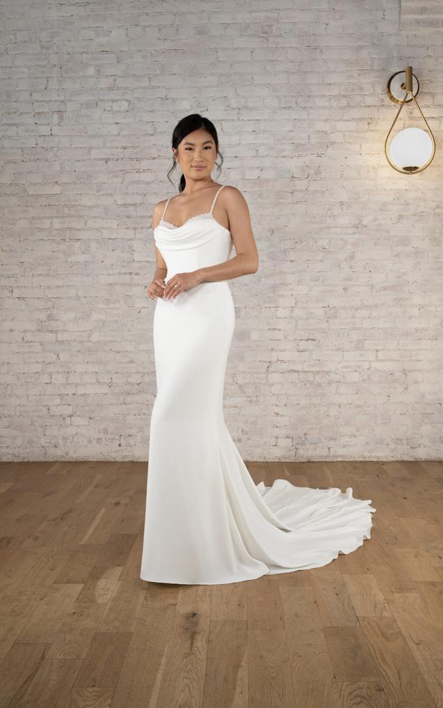This wedding dress features thin, beaded spaghetti straps that meet a flattering draped sweetheart, embellished neckline. Luxe shell crepe fabric gently glides over the figure, melting into an opulent column silhouette with a stunning low back detail.