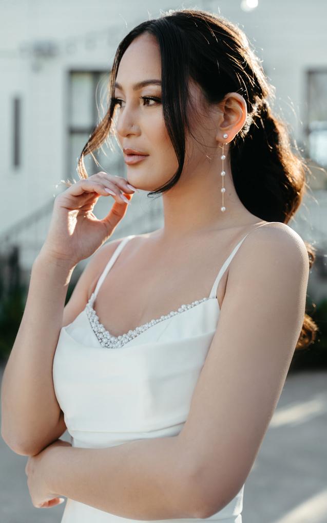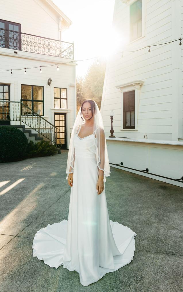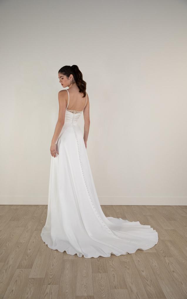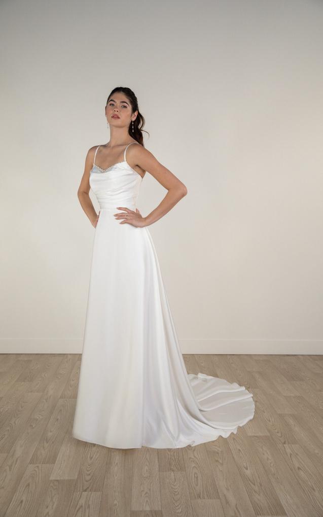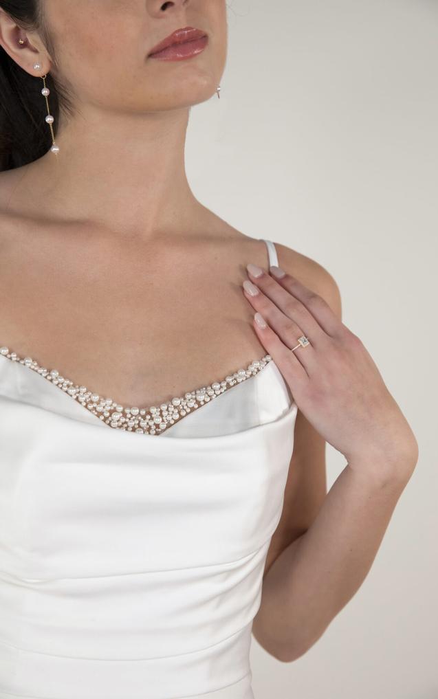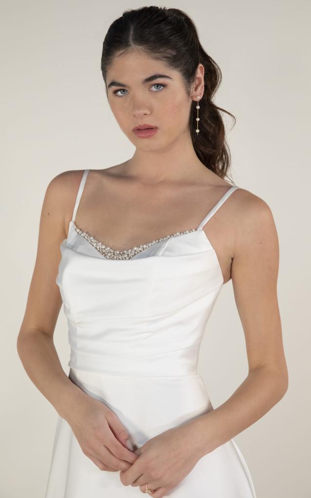 This pearl-embellished wedding dress features an A-line silhouette in a lustrous, high shine satin. Delicate spaghetti straps complement a softly draped scoop neckline accented by graceful pearl strands for a subtle yet opulent touch.