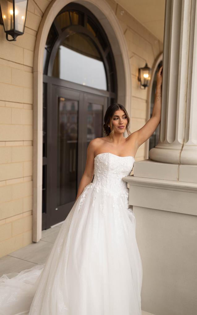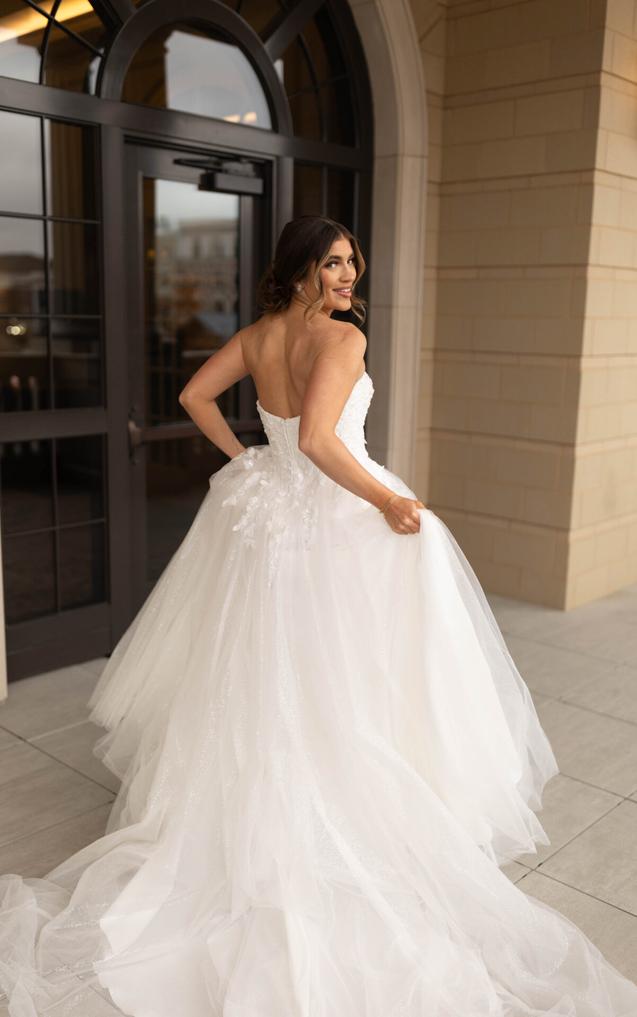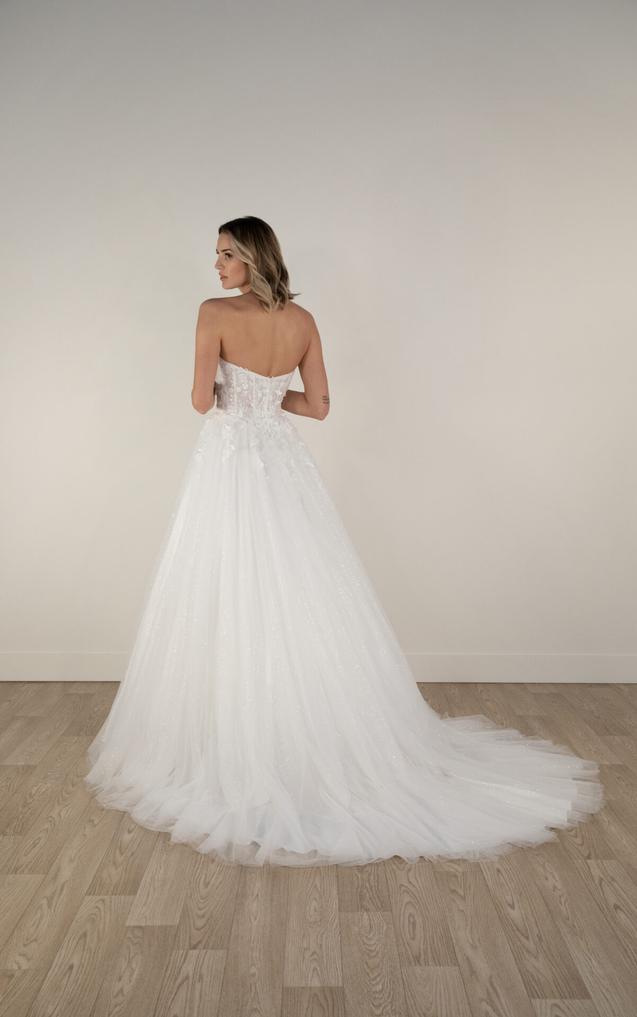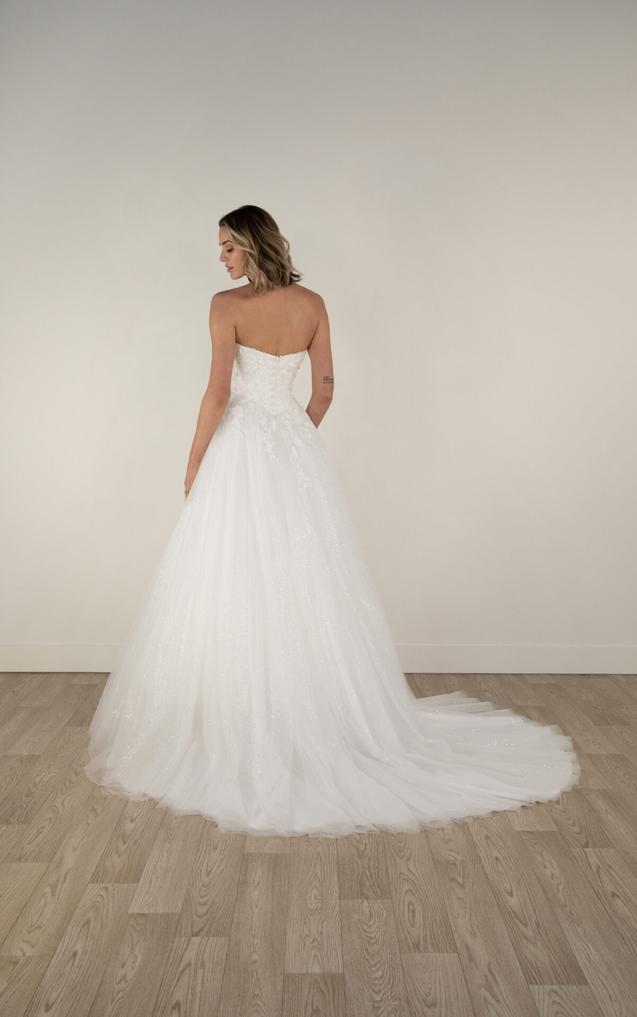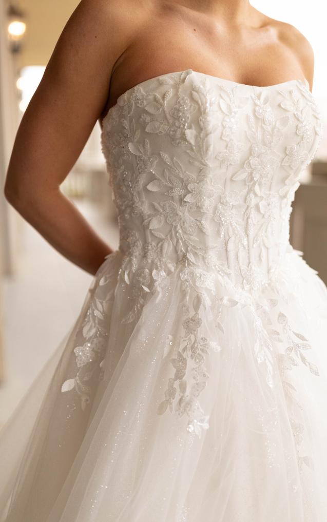 (Bodice Unlined or Lined) From a scooped strapless neckline, the impeccably-tailored bodice flourishes with intricate embellished lace and delicate 3D floral accents. Cascading past the waistline, floral tendrils dissipate into a sea of sparkling layers of glitter tulle.