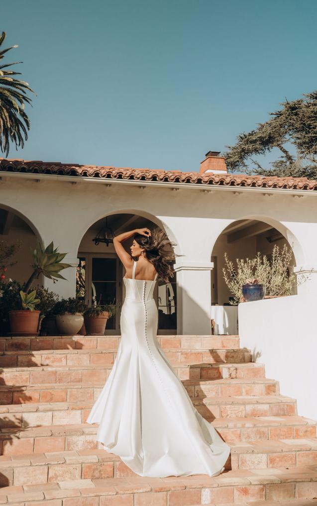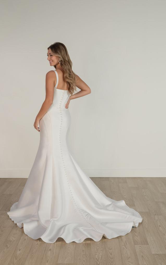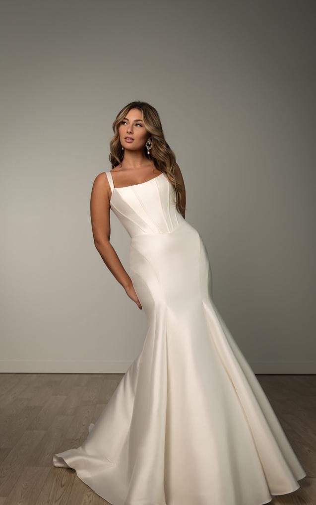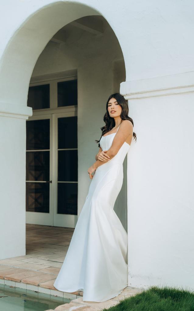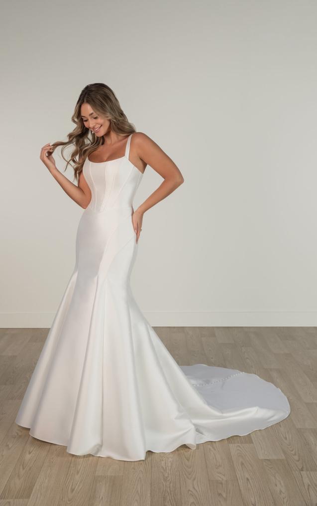This ultra-chic fit-and-flare wedding dress features a classic scoop neckline and wide straps, offering a refined yet modern appeal. Thoughtfully designed seaming enhances the figure, while the structured corset bodice provides a flattering, tailored fit.