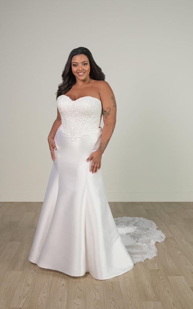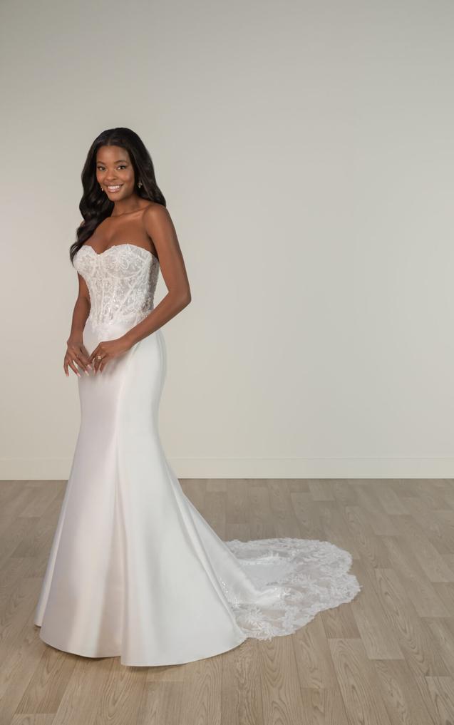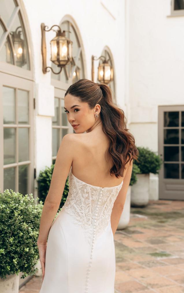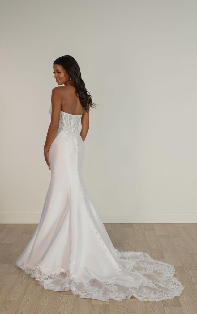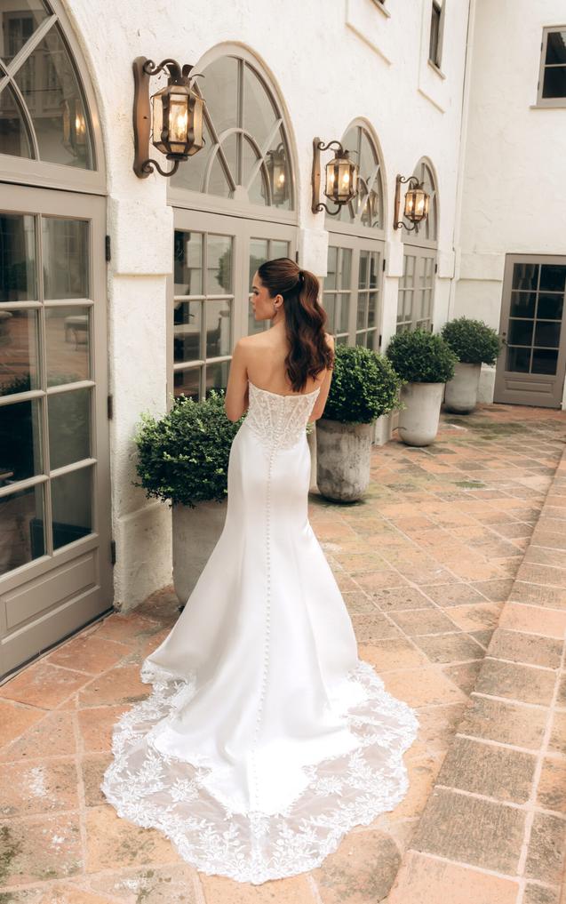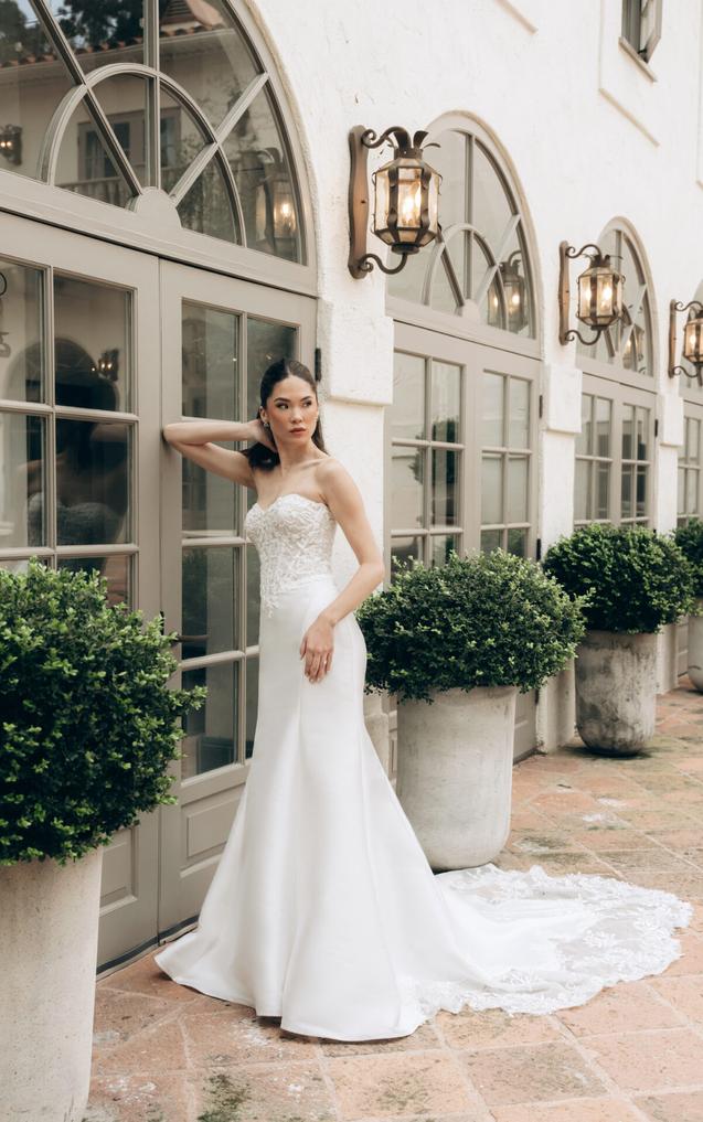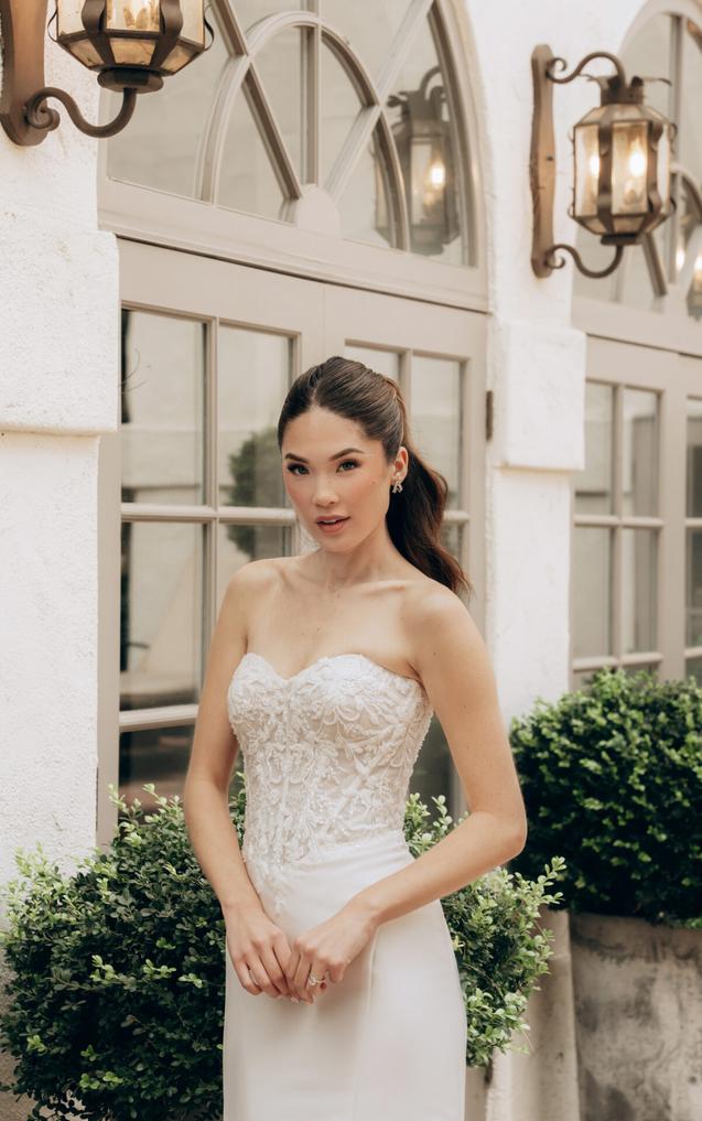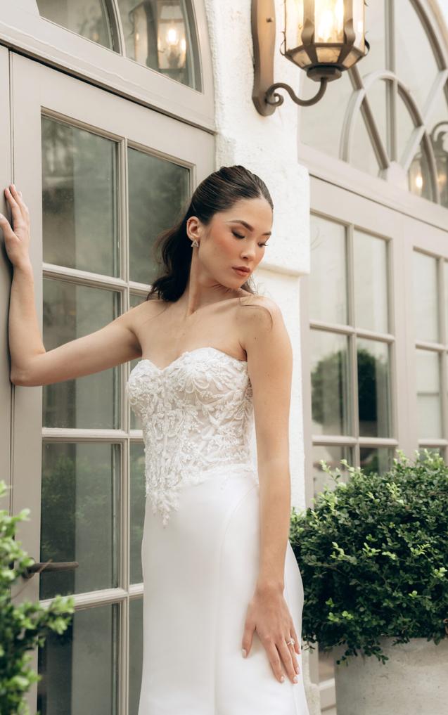 (Bodice Unlined or Lined) The strapless, corset-inspired bodice stuns with shimmering scrolls of lace and striking exposed boning, sculpting the waist with impeccable detail. Flowing past the sleek basque waistline, the exquisite lace cascades onto the luxe Mikado skirt.