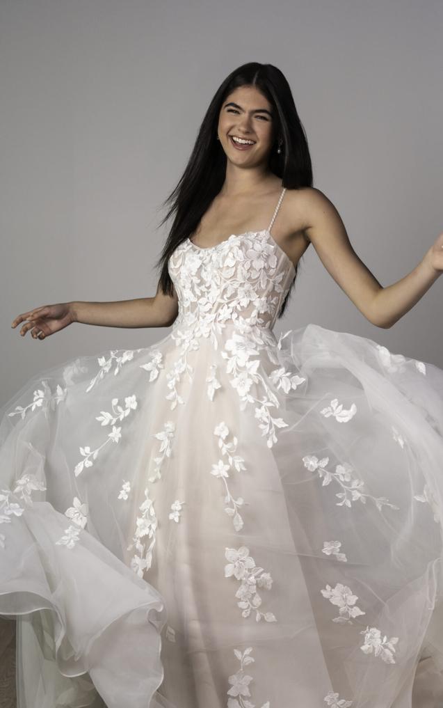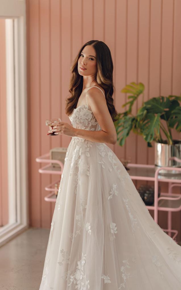 This wedding dress features a sweetheart neckline with a sheer tulle bodice richly covered in lace appliqués that gently cascade down the frothy skirt. The fitted bodice highlights intricate floral patterns, creating a textured look.