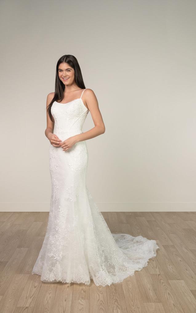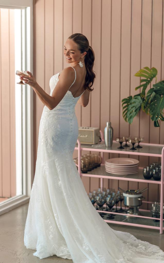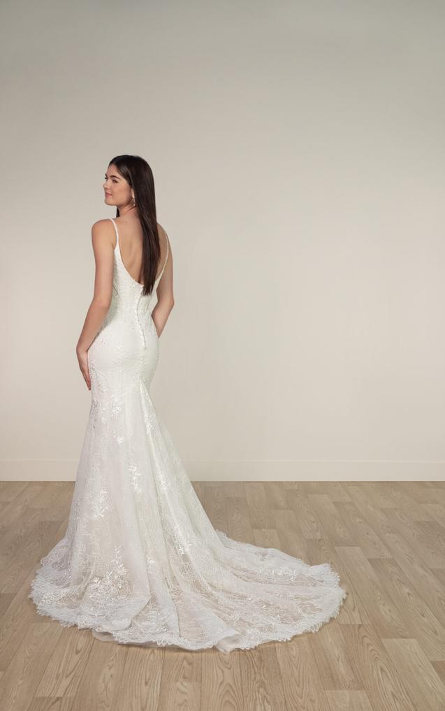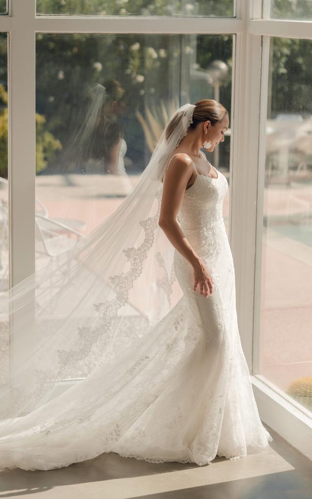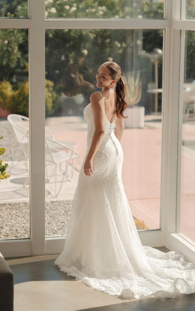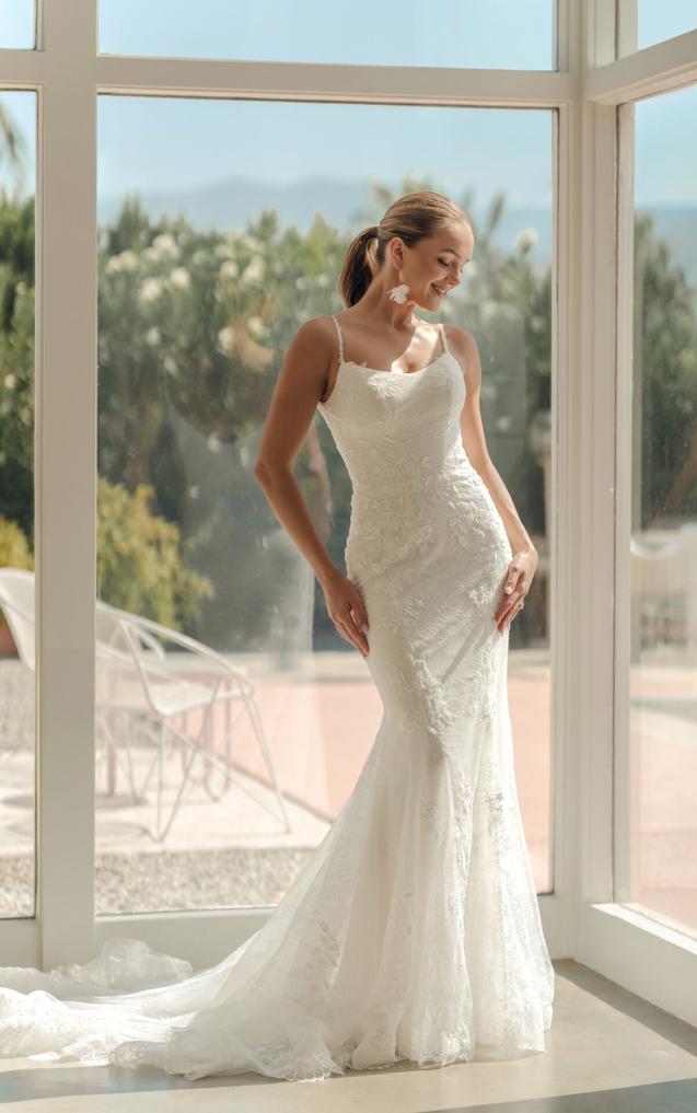 (COMING SOON!) This chic matte floral lace gown is timeless. Featuring delicate beaded straps that frame a graceful sweetheart neckline, the fitted bodice is structured with classic corset boning for a flattering silhouette and added support.
